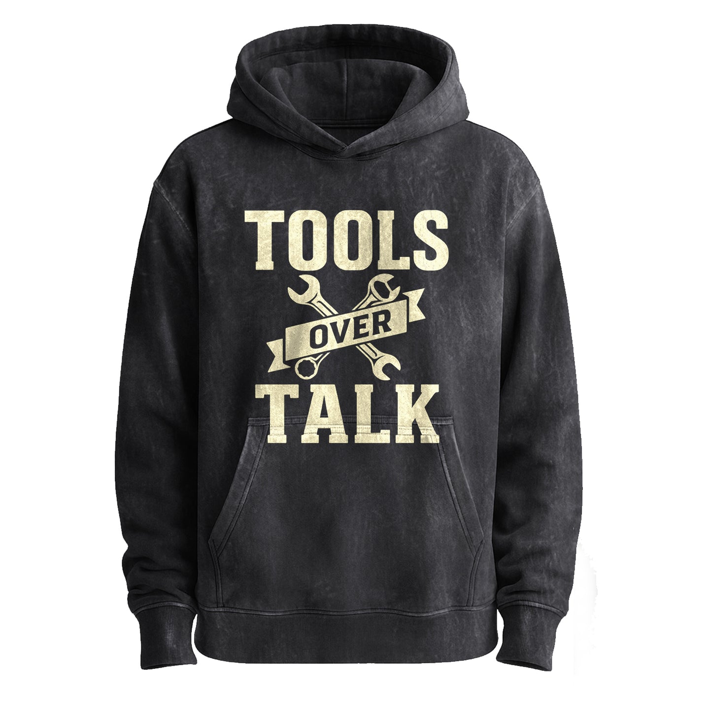 This vintage military green hoodie features bold distressed bone/ivory typography reading “TOOLS / TALK,” centered over crossed wrench icons with a banner that reads “OVER.”