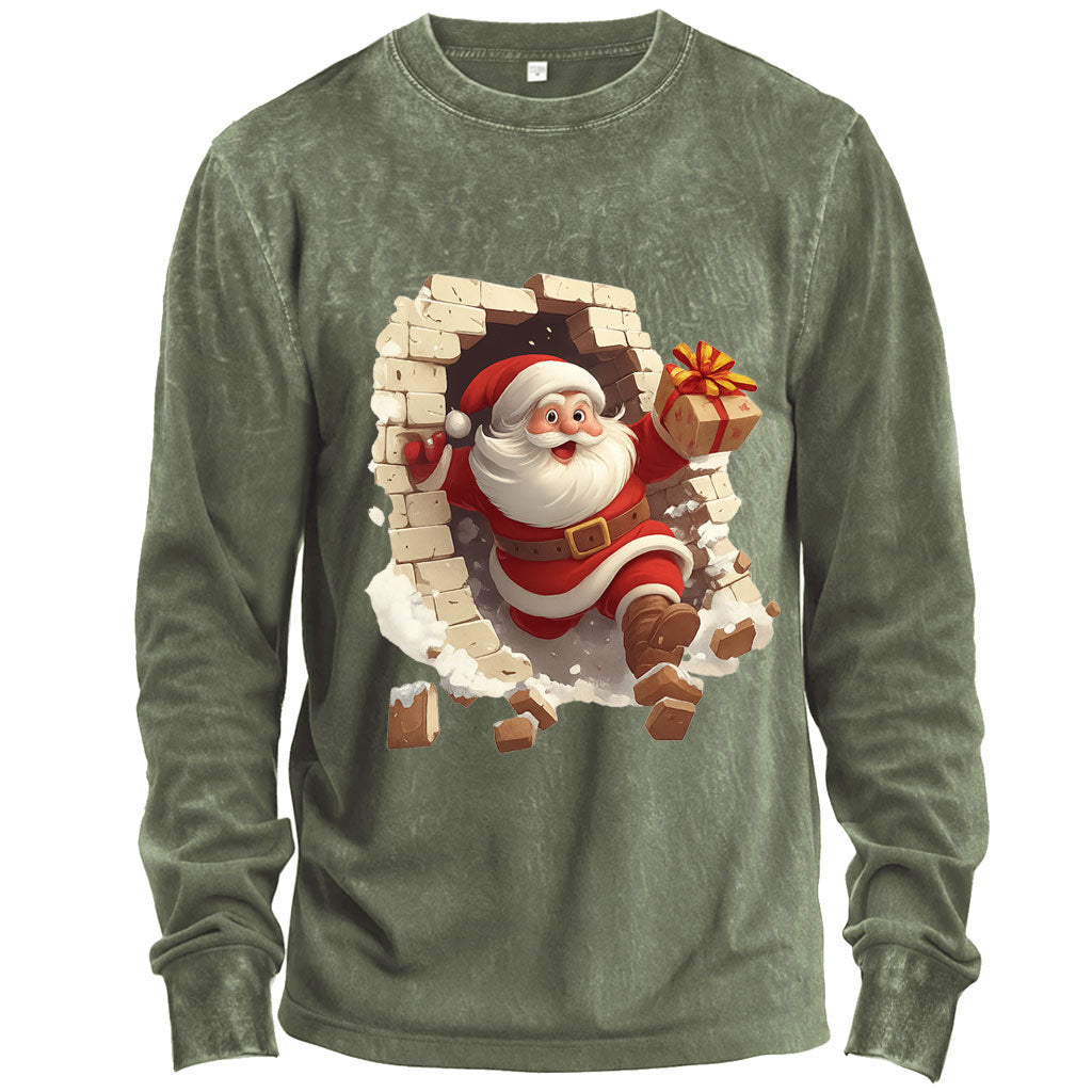 Bring holiday fun straight through the walls with the LouMark “Santa Breakthrough” long sleeve tee. Featuring a bold illustration of Santa bursting through bricks with gifts in hand, this design combines playful Christmas spirit with a dynamic, energetic visual style. Crafted from 230G 100% cotton, it offers a comfortable yet structured fit that works perfectly for cool weather layering.