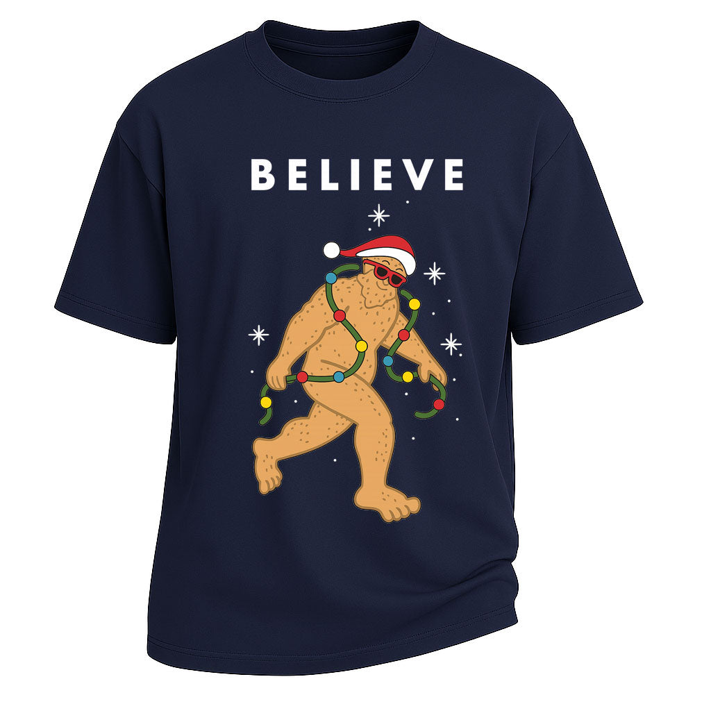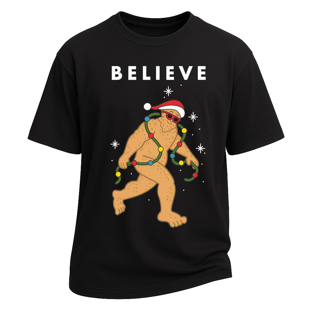Bring a touch of mystery and laughter to your holiday wardrobe with LouMark’s “Believe” T-shirt — featuring a festive Bigfoot wrapped in Christmas lights and wearing a Santa hat. Perfect for believers, skeptics, and anyone who loves a good laugh.