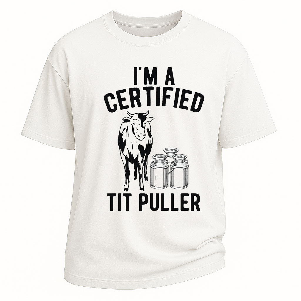 Bring farm humor to the forefront with LouMark’s “I’m a Certified Tit Puller” T-shirt — a cheeky and lighthearted design featuring a dairy cow and milk cans, perfect for farmers, country folks, or anyone who loves a good laugh.