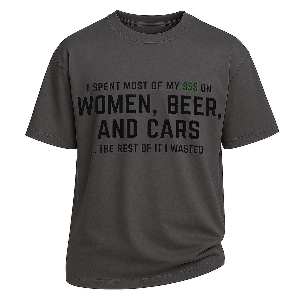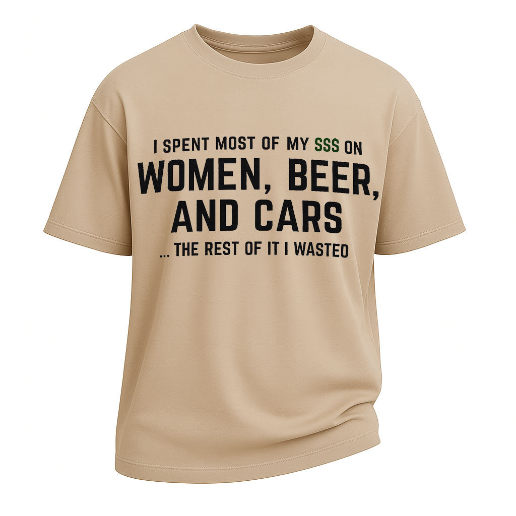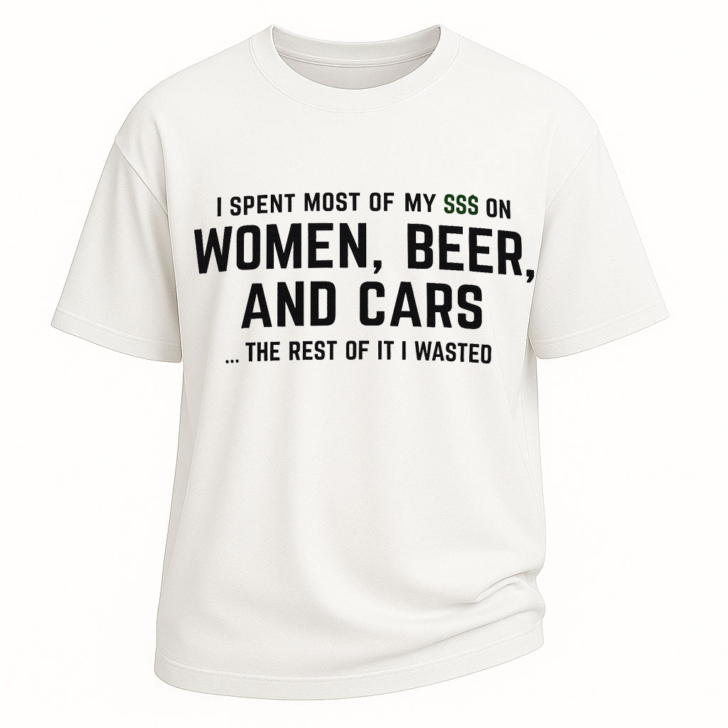 Make a bold statement with LouMark’s “Women, Beer, and Cars” T-shirt — featuring the hilarious quote “I spent most of my $$ on women, beer, and cars... the rest of it I wasted.” Perfect for men who live loud, laugh hard, and never take life too seriously.