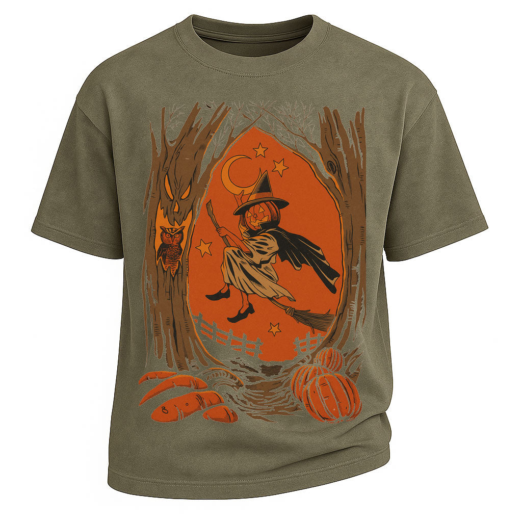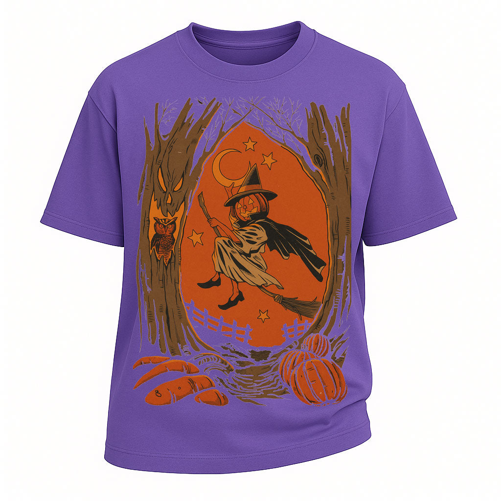 Step into the spirit of Halloween with LouMark’s "Witch Pumpkin Patch" oversized tee. Crafted from 260G heavyweight 100% cotton, this shirt offers durability, comfort, and a premium oversized silhouette. The front showcases a vintage-inspired illustration of a witch flying past a crescent moon, framed by autumn trees, pumpkins, and rustic fall elements. Designed for those who love Halloween charm with a touch of retro artistry, it’s the perfect seasonal statement piece.