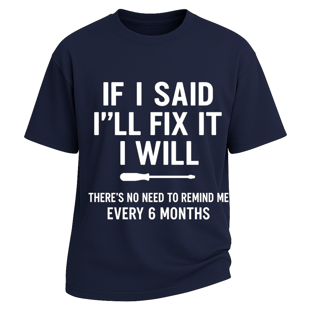 Pattern: Bold white text print with screwdriver graphic, reads “If I said I’ll fix it I will – there’s no need to remind me every 6 months”