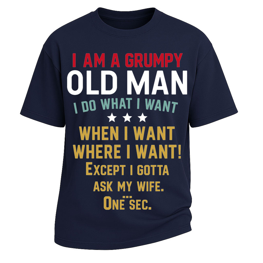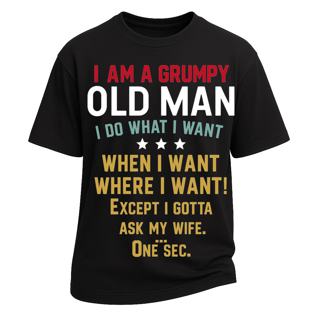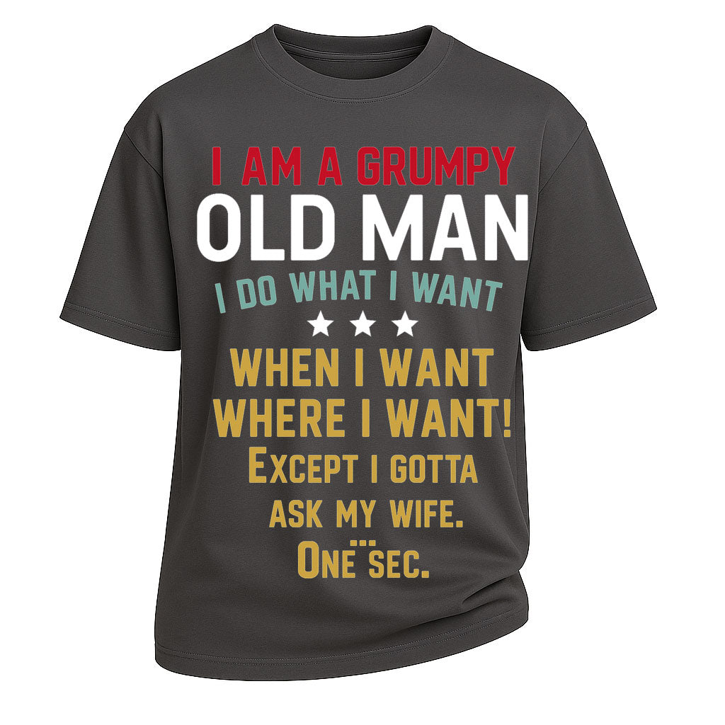 Regular price $26.99 USDBring humor and honesty together with LouMark’s Grumpy Old Man Ask My Wife Tee. Made from heavy 260G 100% cotton, this oversized T-shirt offers relaxed comfort and rugged style. The multicolor text reads: “I AM A GRUMPY OLD MAN. I DO WHAT I WANT, WHEN I WANT, WHERE I WANT! Except I gotta ask my wife. One sec.” A playful balance of bold masculinity and marital truth, perfect for husbands with a sense of humor.