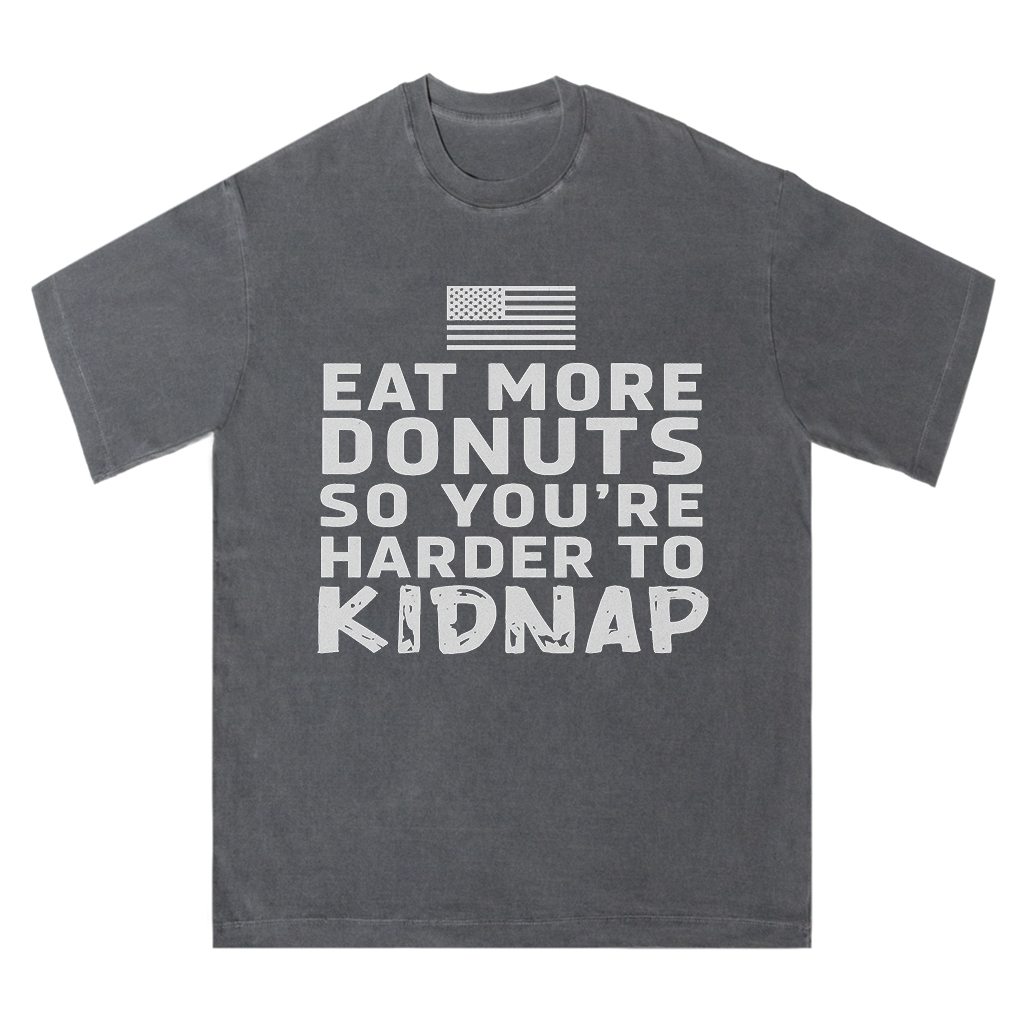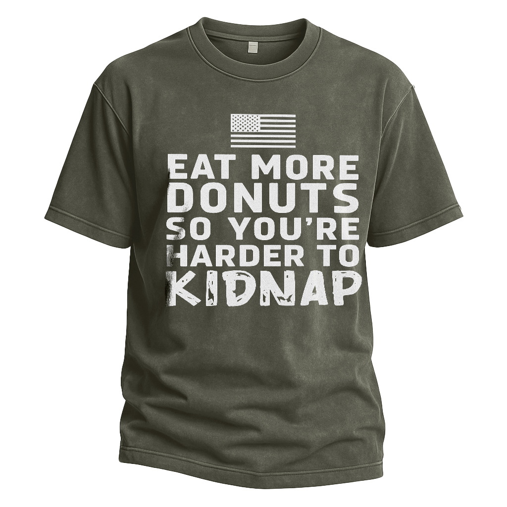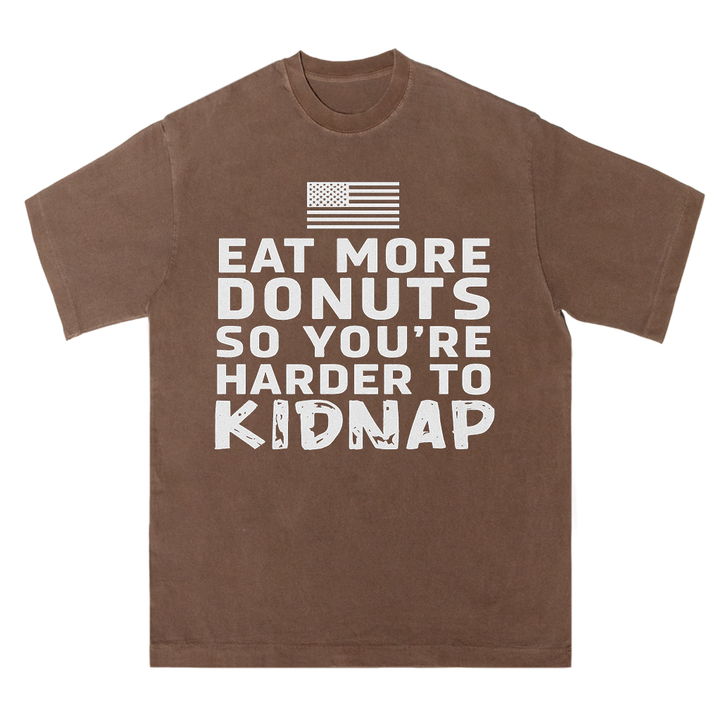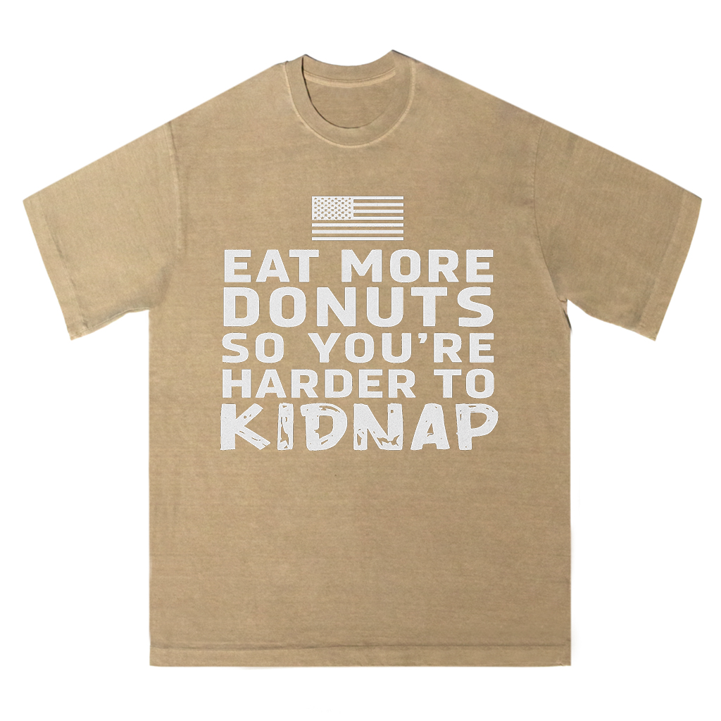 Regular price $26.99 USDMake a playful statement with LouMark’s Eat More Donuts Tee. This washed tan shirt features bold white typography on the front reading “EAT MORE DONUTS SO YOU’RE HARDER TO KIDNAP,” accompanied by a small American flag graphic. Crafted from 100% cotton for comfortable casual wear with a cheeky attitude.