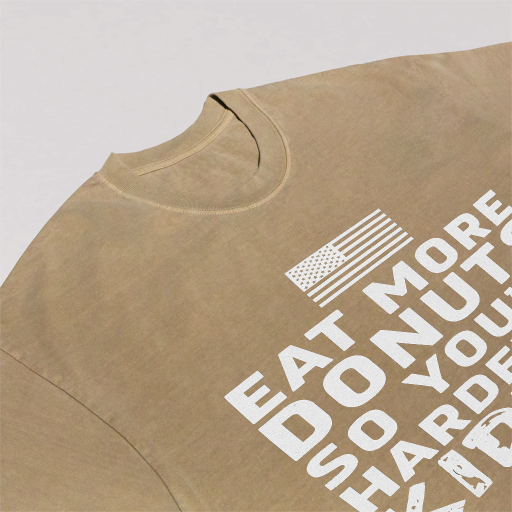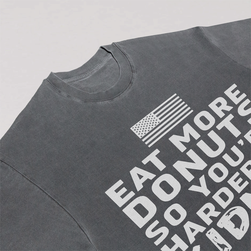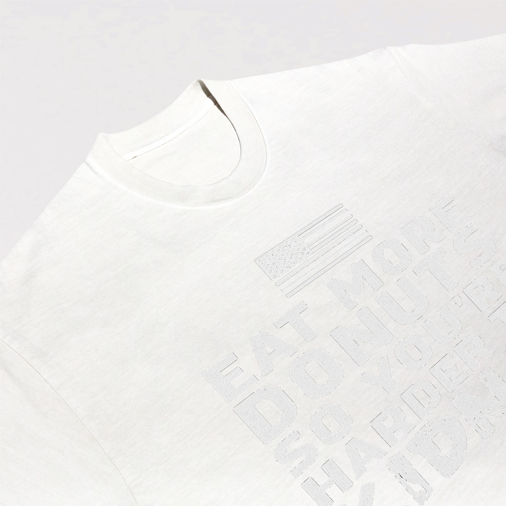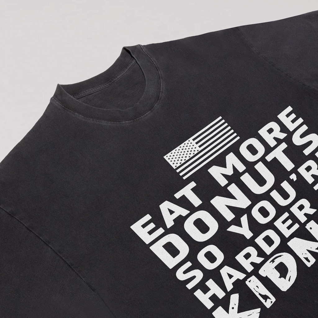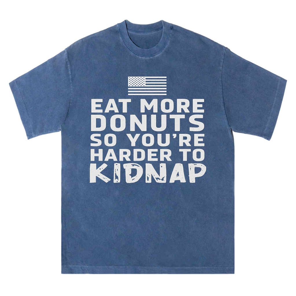 Regular price $26.99 USDMake a playful statement with LouMark’s Eat More Donuts Tee. This washed tan shirt features bold white typography on the front reading “EAT MORE DONUTS SO YOU’RE HARDER TO KIDNAP,” accompanied by a small American flag graphic. Crafted from 100% cotton for comfortable casual wear with a cheeky attitude.