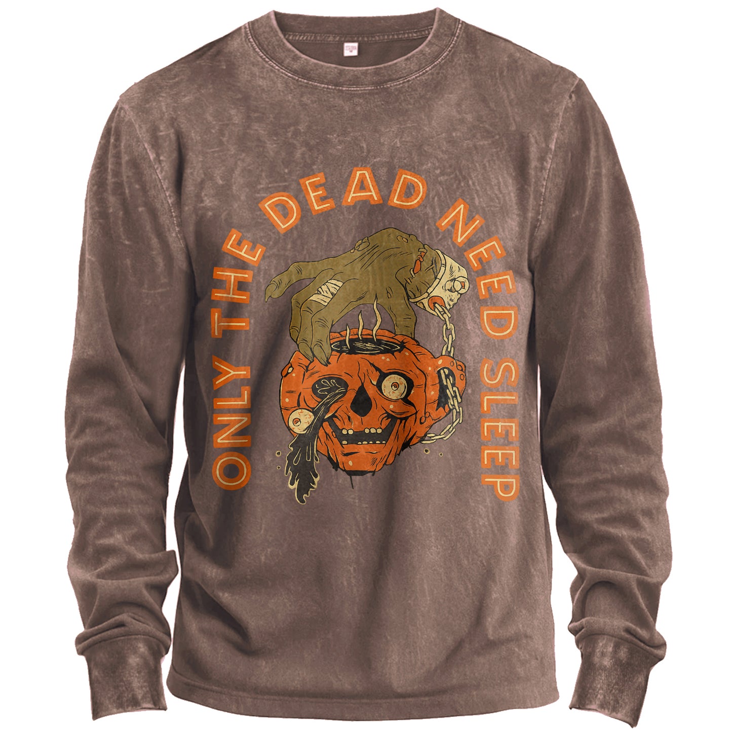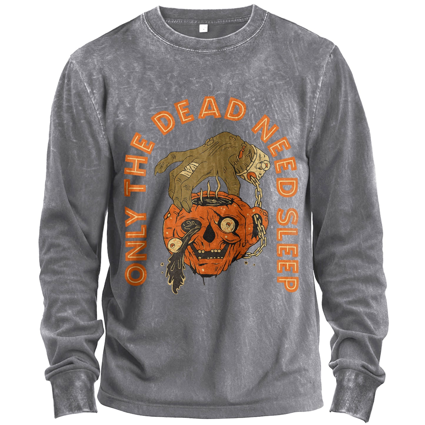 Regular price $24.99 USDFor the night owls and the never-say-die. This vintage-washed army-green long-sleeve T-shirt features a gritty Halloween graphic: a zombie hand gripping a chained jack-o’-lantern skull, framed by bold orange lettering that reads “ONLY THE DEAD NEED SLEEP.” Cut from soft 100% cotton for a broken-in feel right out of the bag.