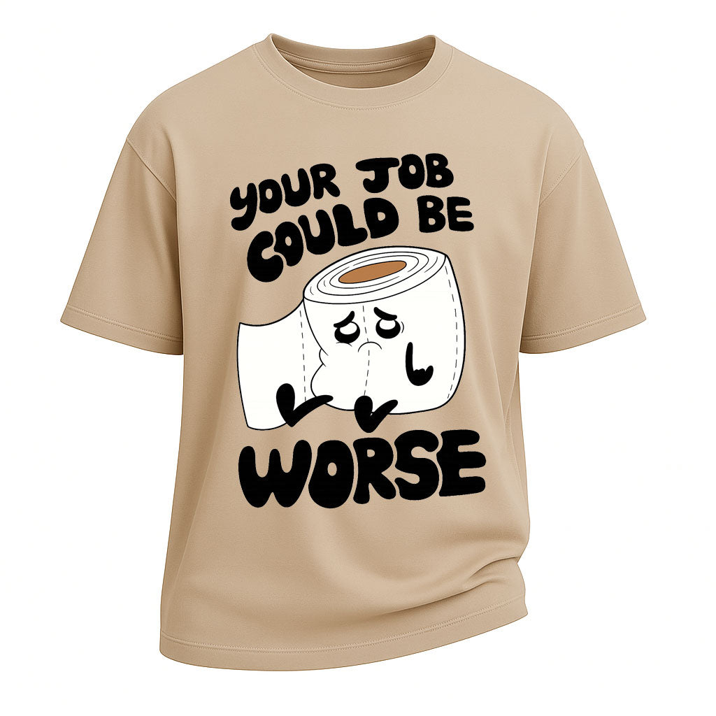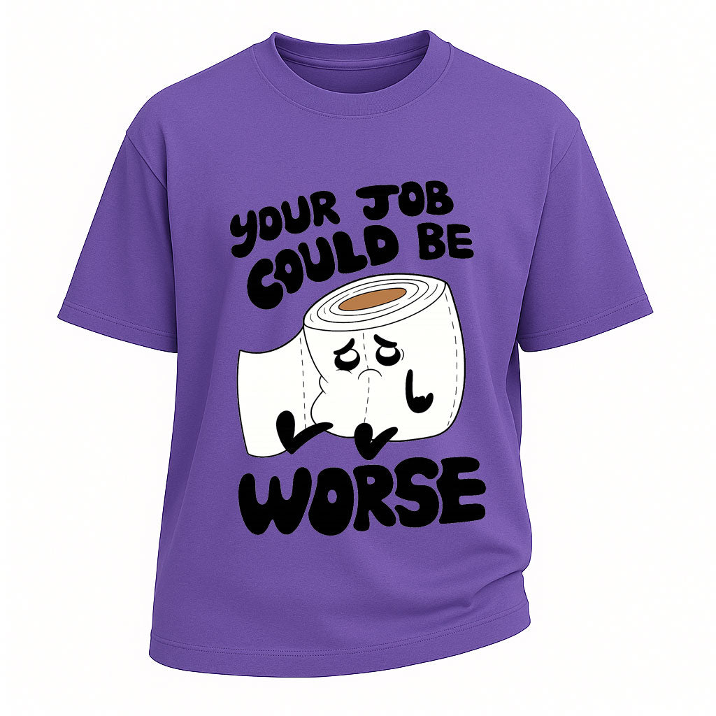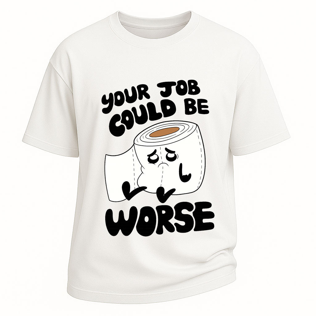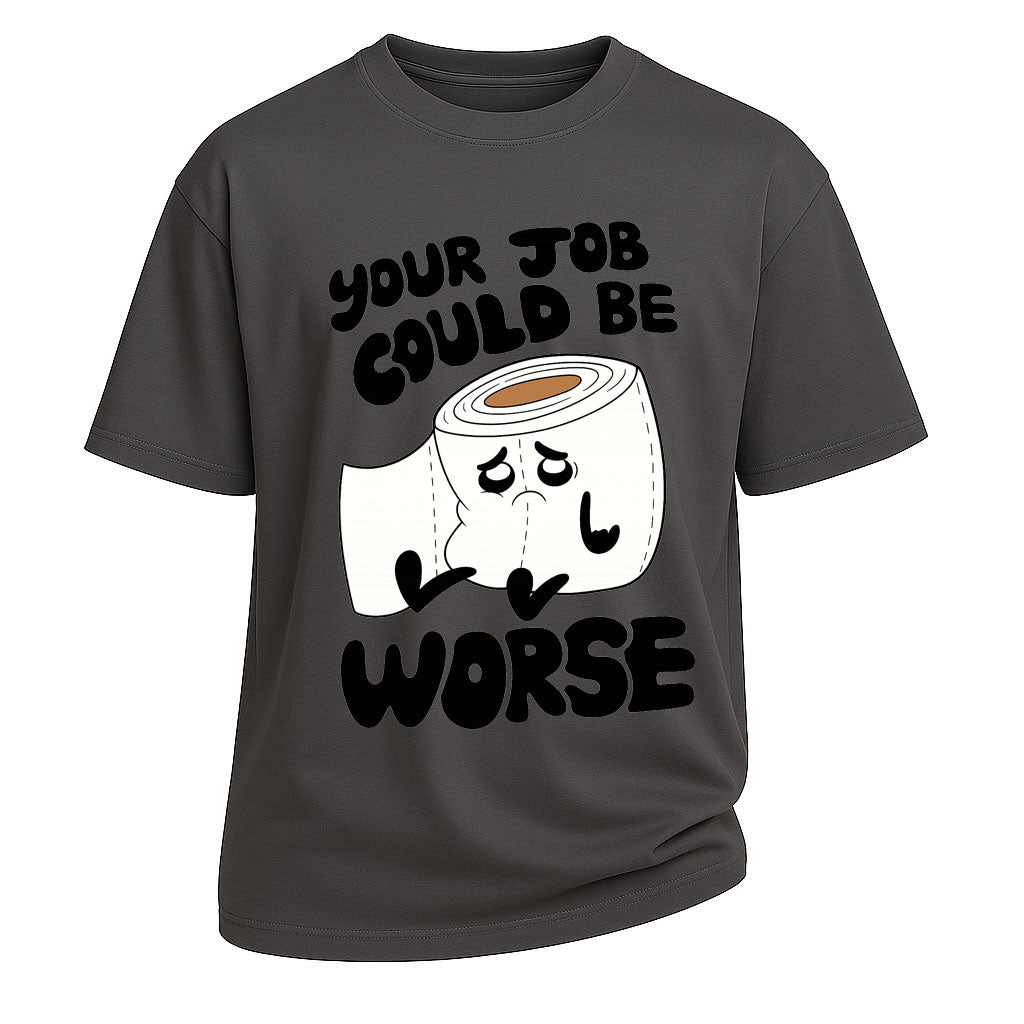 Regular price $24.99 USDAdd a roll of humor to your day with LouMark’s “Your Job Could Be Worse” T-shirt — featuring a sad cartoon toilet paper roll that delivers laughs and perspective in equal measure.