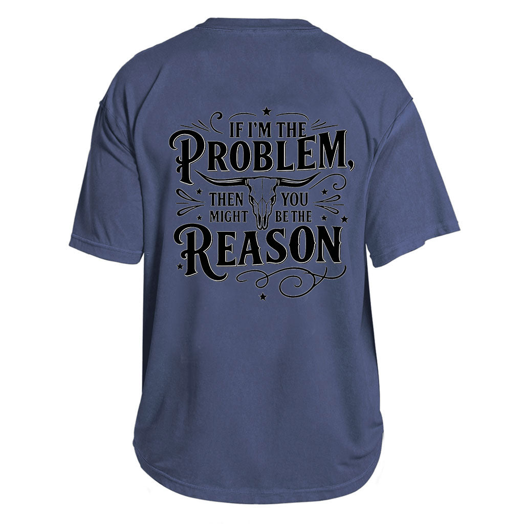 Regular price $22.99 USDAssert your attitude in bold Western style with our “If I'm the Problem, Then You Might Be the Reason” tee. Featuring a striking double-sided design, the front bears the minimalist LouMark steer skull logo for authentic branding, while the back showcases an ornate Western script framed with longhorn horns and star accents. Made from a garment-washed cotton fabric for a soft, vintage feel, it’s the perfect shirt for those who aren’t afraid to speak their mind. Wear it under the wide sky or at the local bar—either way, the message is loud and clear.