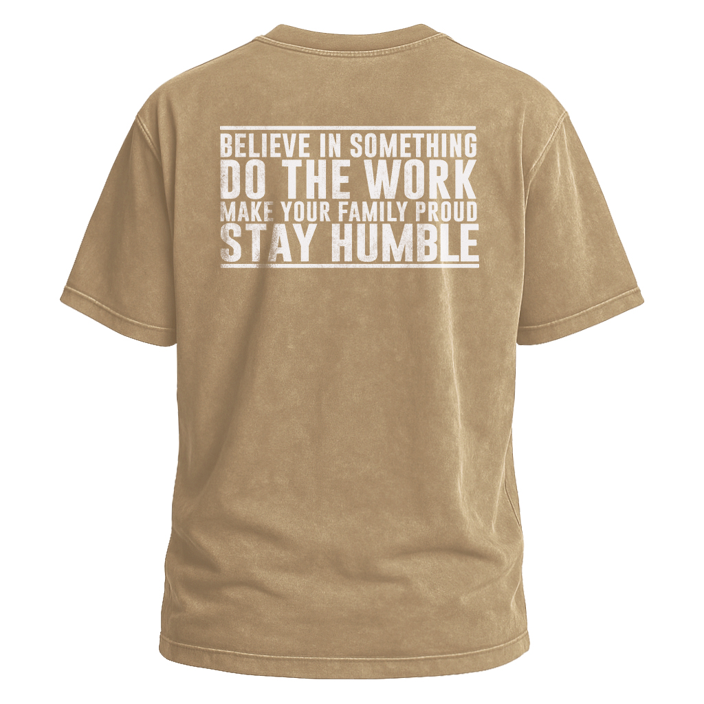 Regulärer Preis $26.99 USDLassen Sie sich inspirieren mit LouMarks „Believe Do Work Stay Humble“-T-Shirt. Dieses verwaschene braune Shirt ziert die weiße Schrift „BELIVE IN SOMETHING DO THE WORK MAKE YOUR FAMILY PROUD STAY HUMBLE“. Hergestellt aus 100 % Baumwolle für hohen Tragekomfort mit motivierender Botschaft.