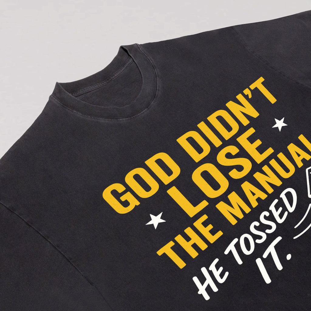 Dieses schwarze T-Shirt im Vintage-Look besticht durch einen auffälligen goldenen und weißen Schriftzug mit der Aufschrift „GOD DIDN'T LOSE THE MANUAL — HE TOSSED IT“. Gefertigt aus dichtem 260-g-Baumwollgewebe für ein weiches und dennoch formstabiles Tragegefühl und lange Haltbarkeit.