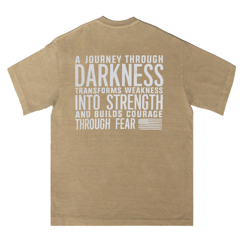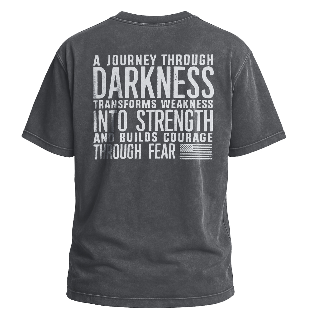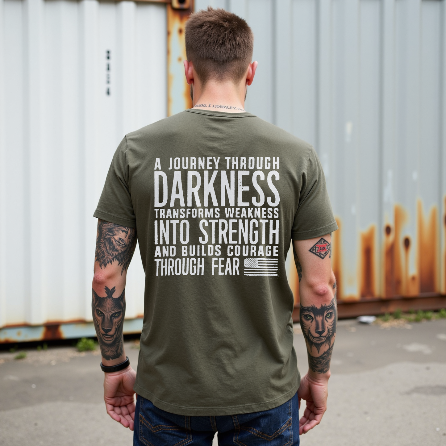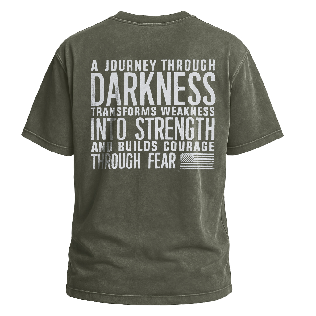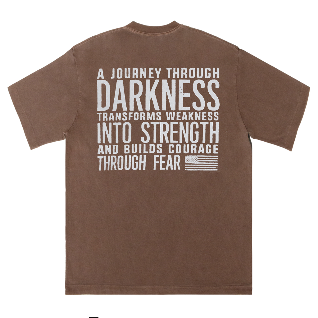 Regulärer Preis $26.99 USDZeigen Sie Widerstandsfähigkeit mit LouMarks „Journey Through Darkness“-T-Shirt. Dieses verwaschene braune Shirt ziert die Rückseite mit der weißen Schrift „A JOURNEY THROUGH DARKNESS TRANSFORMS WEAKNESS INTO STRENGTH AND BUILDS COURAGE THROUGH FEAR“. Hergestellt aus 100 % Baumwolle für bequeme Freizeitkleidung mit einer ermutigenden Botschaft.