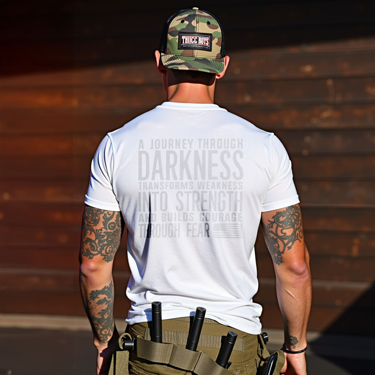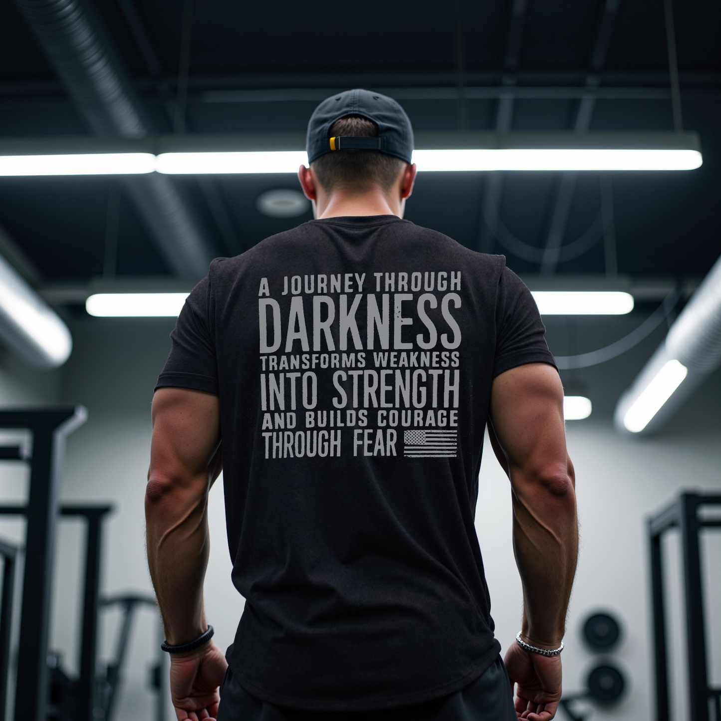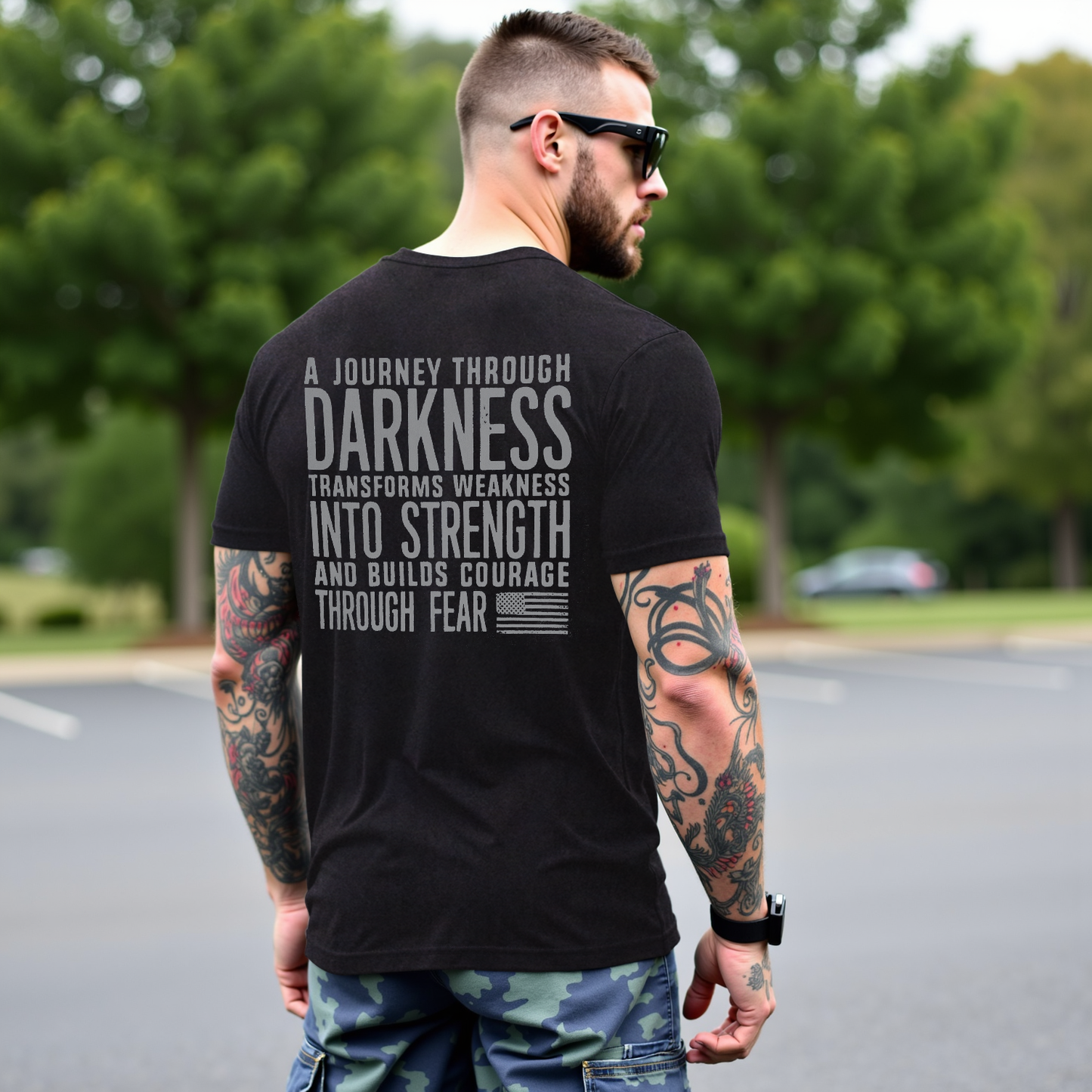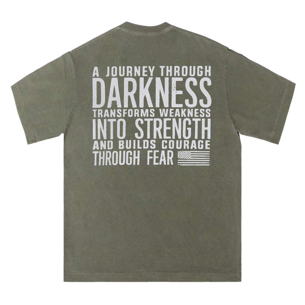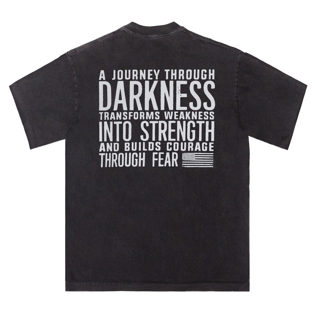 Regulärer Preis $26.99 USDZeigen Sie Widerstandsfähigkeit mit LouMarks „Journey Through Darkness“-T-Shirt. Dieses verwaschene braune Shirt ziert die Rückseite mit der weißen Schrift „A JOURNEY THROUGH DARKNESS TRANSFORMS WEAKNESS INTO STRENGTH AND BUILDS COURAGE THROUGH FEAR“. Hergestellt aus 100 % Baumwolle für bequeme Freizeitkleidung mit einer ermutigenden Botschaft.