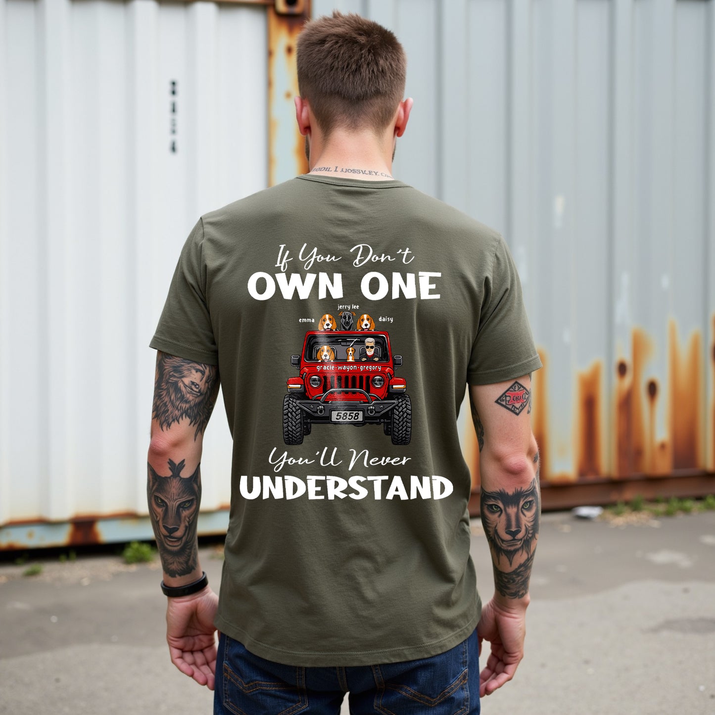 Regulärer Preis $26.99 USDFeiern Sie den Jeep-Lifestyle mit LouMarks „Own One Jeep Life“-T-Shirt. Dieses verwaschene braune Shirt zeigt auf der Rückseite einen roten Jeep im Vintage-Stil mit vier Hunden darin und dem fettgedruckten Text „If You Don't Own One You'll Never Understand“. Hergestellt aus 100 % Baumwolle für bequemen, lässigen Tragekomfort mit robustem Outdoor-Geist.