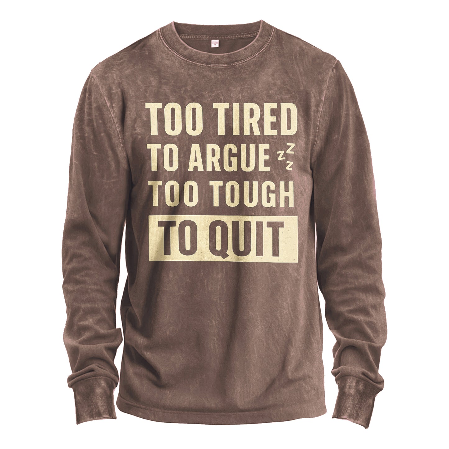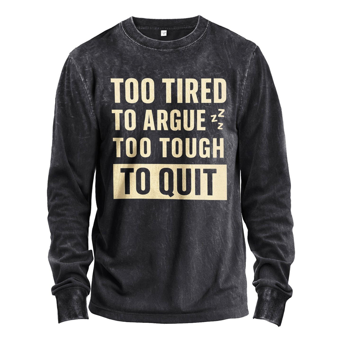 Vintage-gewaschener, militärolivfarbener Korpus mit übergroßer, abgenutzter elfenbeinfarbener Typografie, die übereinander die Worte „TOO TIRED / TO ARGUE“ stapelt, akzentuiert durch winzige Zzz-Zeichen, dann ein fetter cremefarbener Blockaufdruck mit der Aufschrift „TOO TOUGH / TO QUIT“.