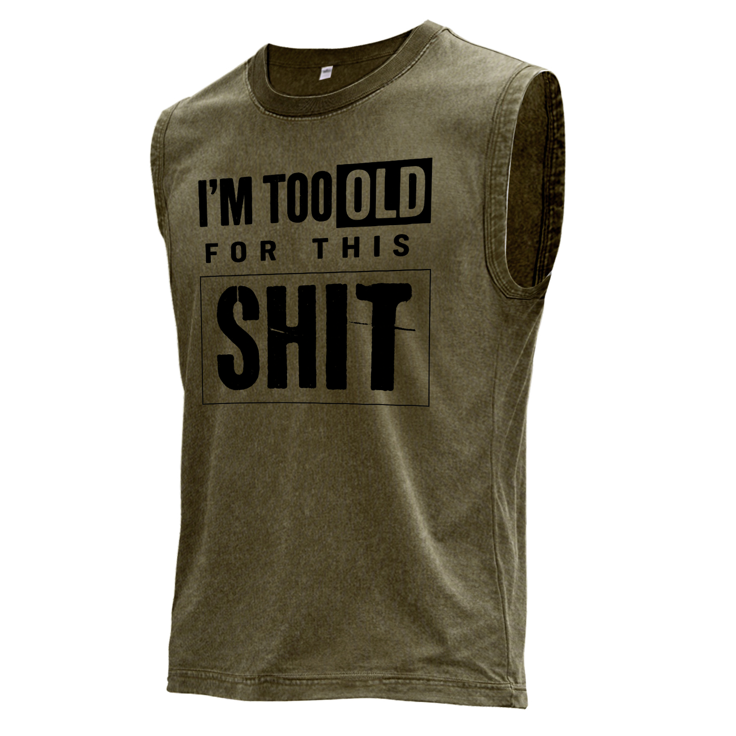 Dieses braune Vintage-Muskelshirt zeichnet sich durch übergroße, abgenutzte weiße Typografie aus: „I'M TOO“ über einem eingerahmten „OLD“, dann „FOR THIS“, abgerundet durch einen großen, umrandeten Block mit der Aufschrift „SHIT“.