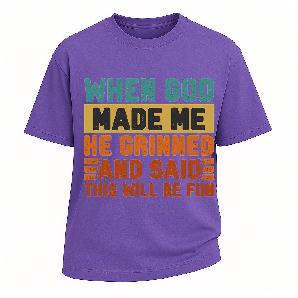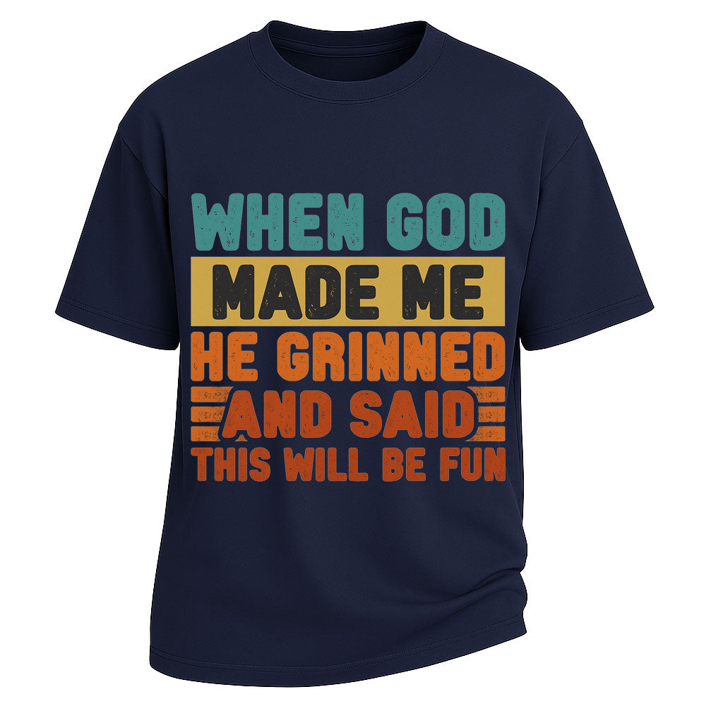 Regulärer Preis $26.99 USDErleben Sie Humor und Komfort mit dem LouMark-T-Shirt „Als Gott mich erschuf, grinste er und sagte: Das wird lustig“. Hergestellt aus 260 g reiner Baumwolle und mit Oversized-Passform, garantiert dieses Shirt Langlebigkeit, Weichheit und Stil. Der markante Schriftzug in leuchtendem Blau, Orange und Rot setzt ein selbstbewusstes Statement – perfekt für alle, die verspielten, vom Glauben inspirierten Humor und lässige Mode lieben.
