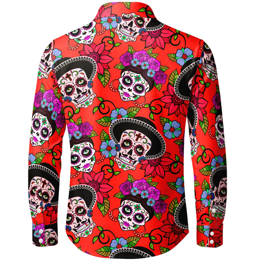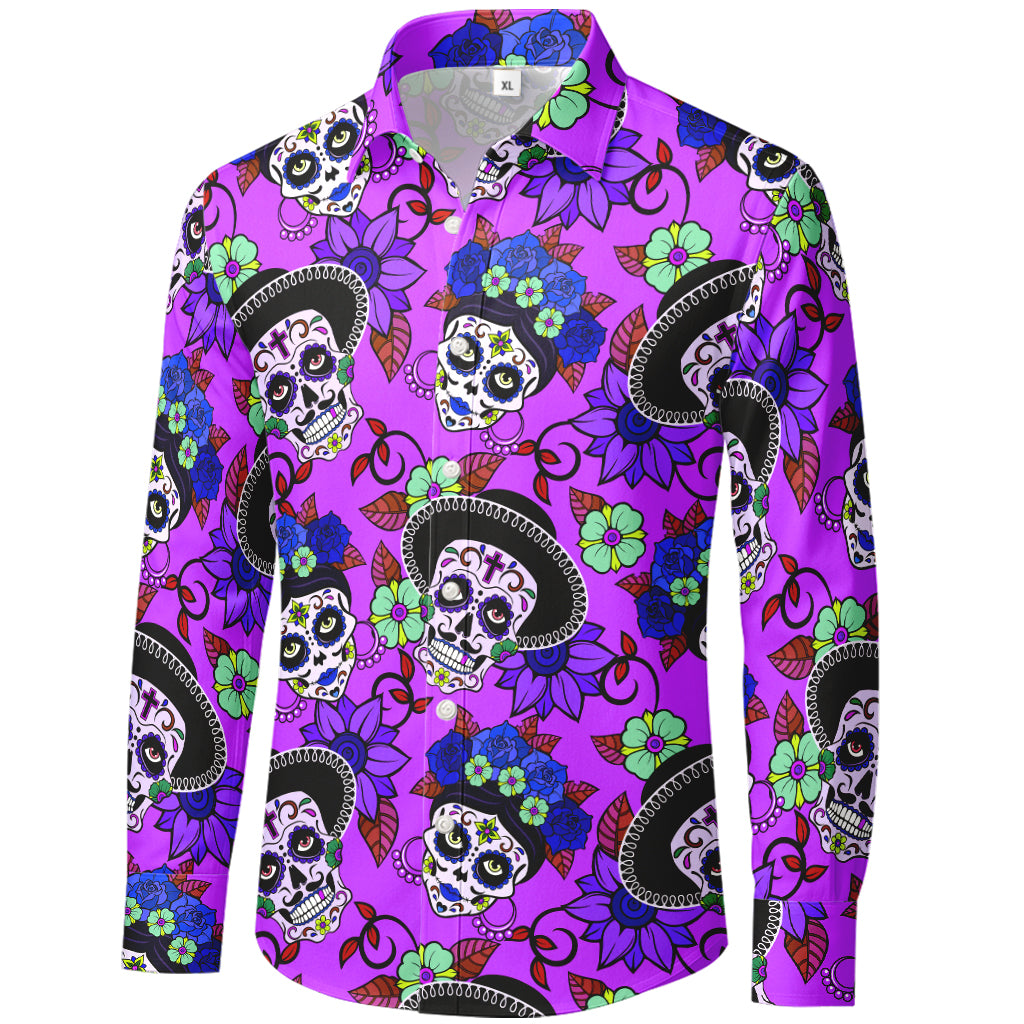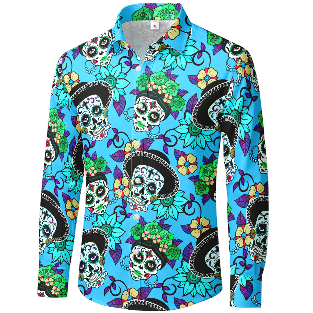 Precio regular $29.99 USDTurn every day into a fiesta. This long-sleeve button-up explodes with colorful Día de los Muertos sugar skulls, flower crowns, and marigolds across a bold sunshine-yellow ground. Printed edge-to-edge for a vivid 3D look, the smooth 100% polyester fabric is lightweight, wrinkle-resistant, and quick-drying—perfect for festivals, parties, or statement streetwear.