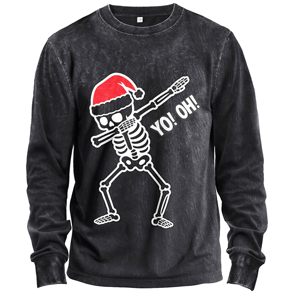Precio regular $24.99 USDHoliday hype with a vintage vibe. This men’s long-sleeve T-shirt pairs an army-green vintage wash with a dabbing skeleton in a Santa hat and the playful “YO! OH!” slogan—built for crisp DTG prints and everyday comfort.