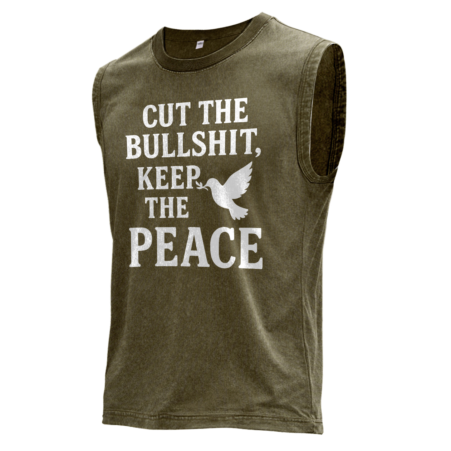 This vintage brown muscle tee features oversized, distressed white typography reading “CUT THE BULLSHIT, KEEP THE PEACE,” paired with a classic dove icon for a firm-but-peaceful stance.