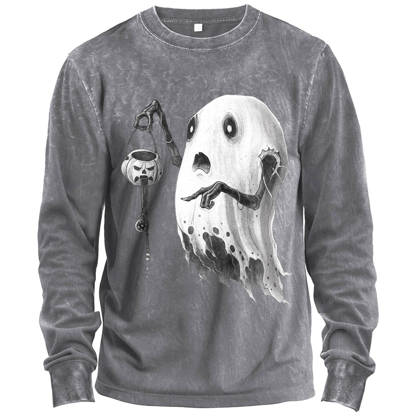Precio regular $24.99 USDHauntingly cozy. This vintage-washed army-green long-sleeve T-shirt features a grayscale ghost with skeletal arms, holding a dripping jack-o’-lantern lantern. Soft, breathable cotton with that broken-in feel from day one.