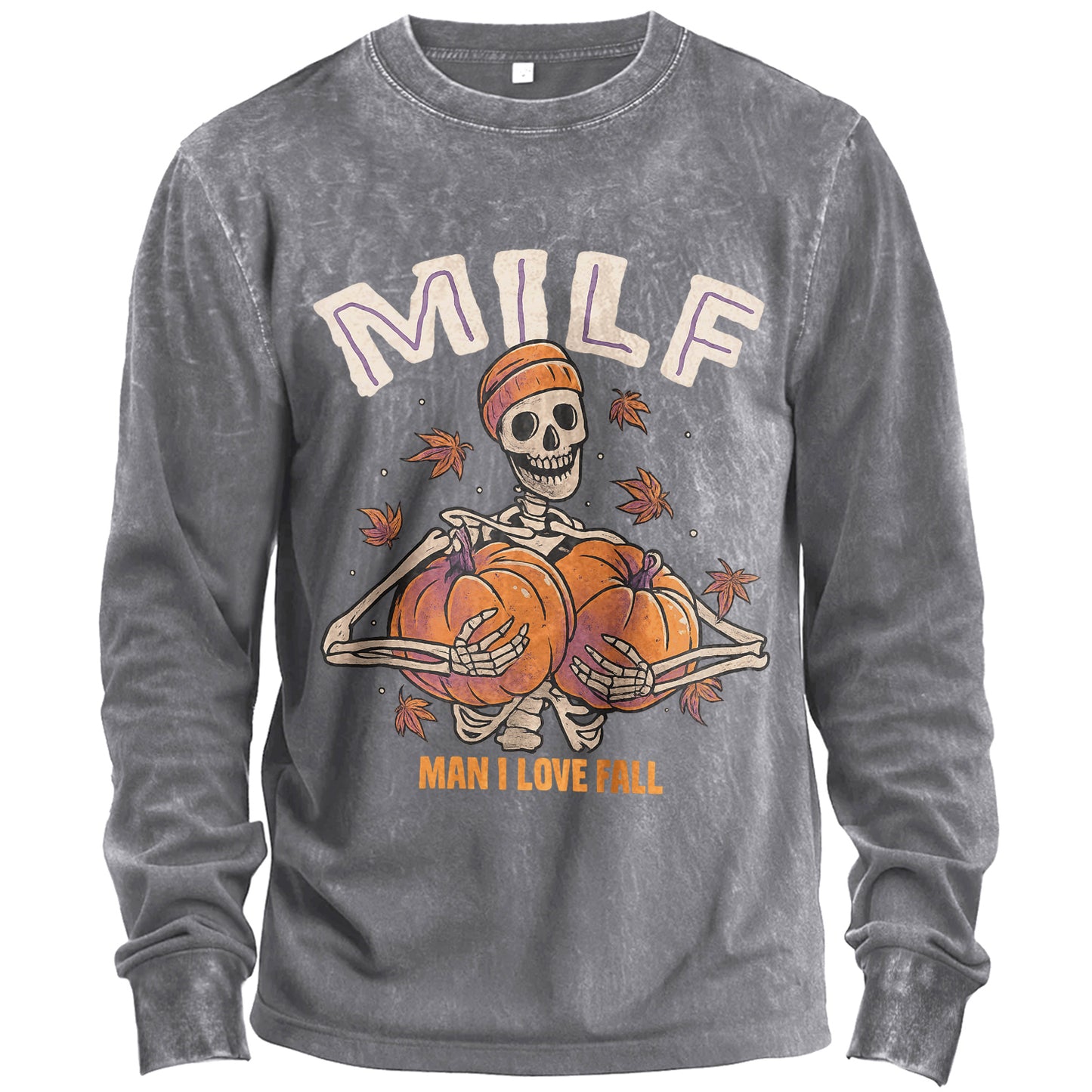 Precio regular $24.99 USDPeak fall energy with a cheeky twist. This vintage-washed army-green long-sleeve T-shirt features a grinning skeleton in a beanie clutching two pumpkins, framed by fluttering leaves and the playful headline “MILF,” with the caption “MAN I LOVE FALL.” Cut from soft 100% cotton for a broken-in feel right out of the bag.