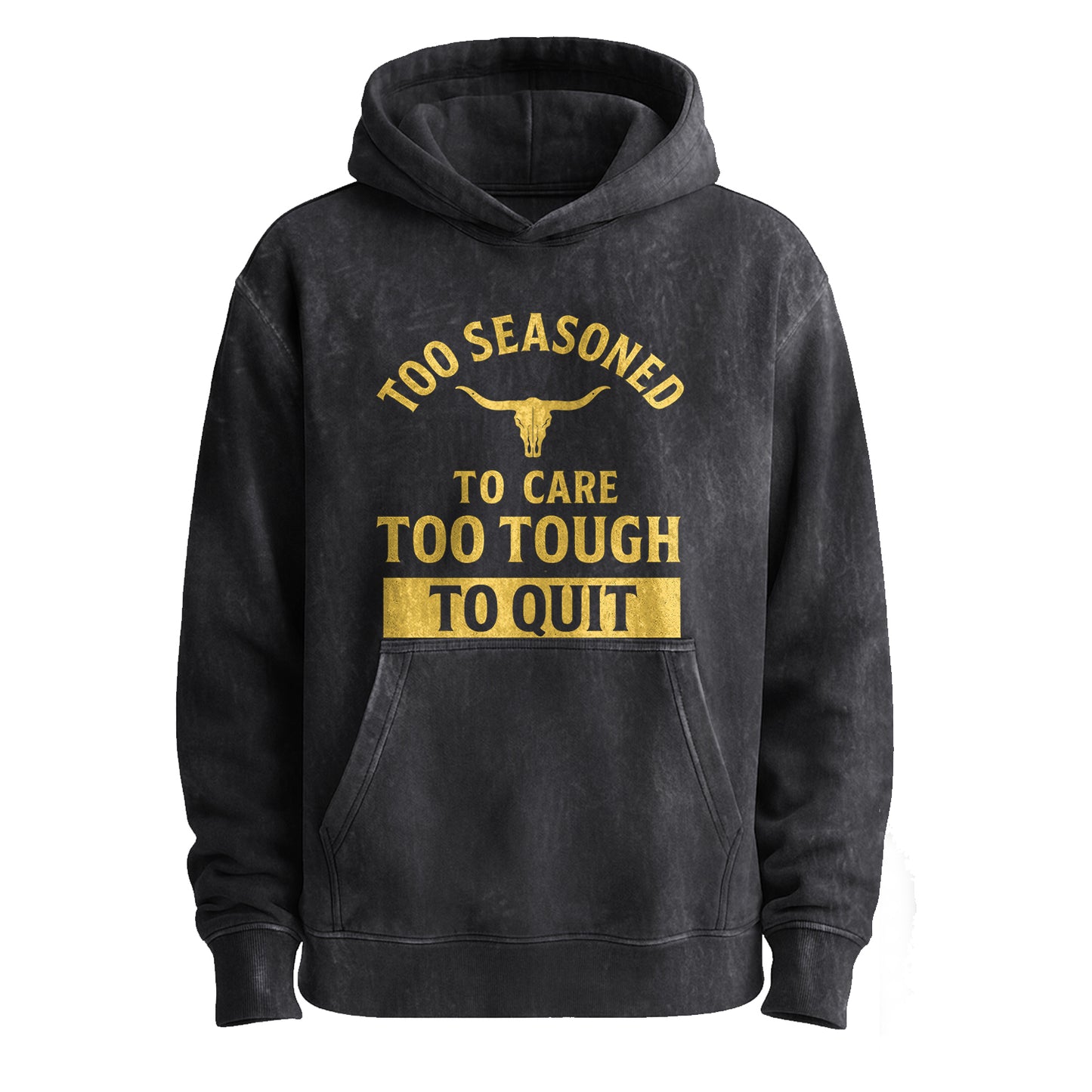 This vintage military green hoodie features distressed gold typography: an arched “TOO SEASONED” with a longhorn skull icon, stacked “TO CARE / TOO TOUGH,” and a bold boxed “TO QUIT.”