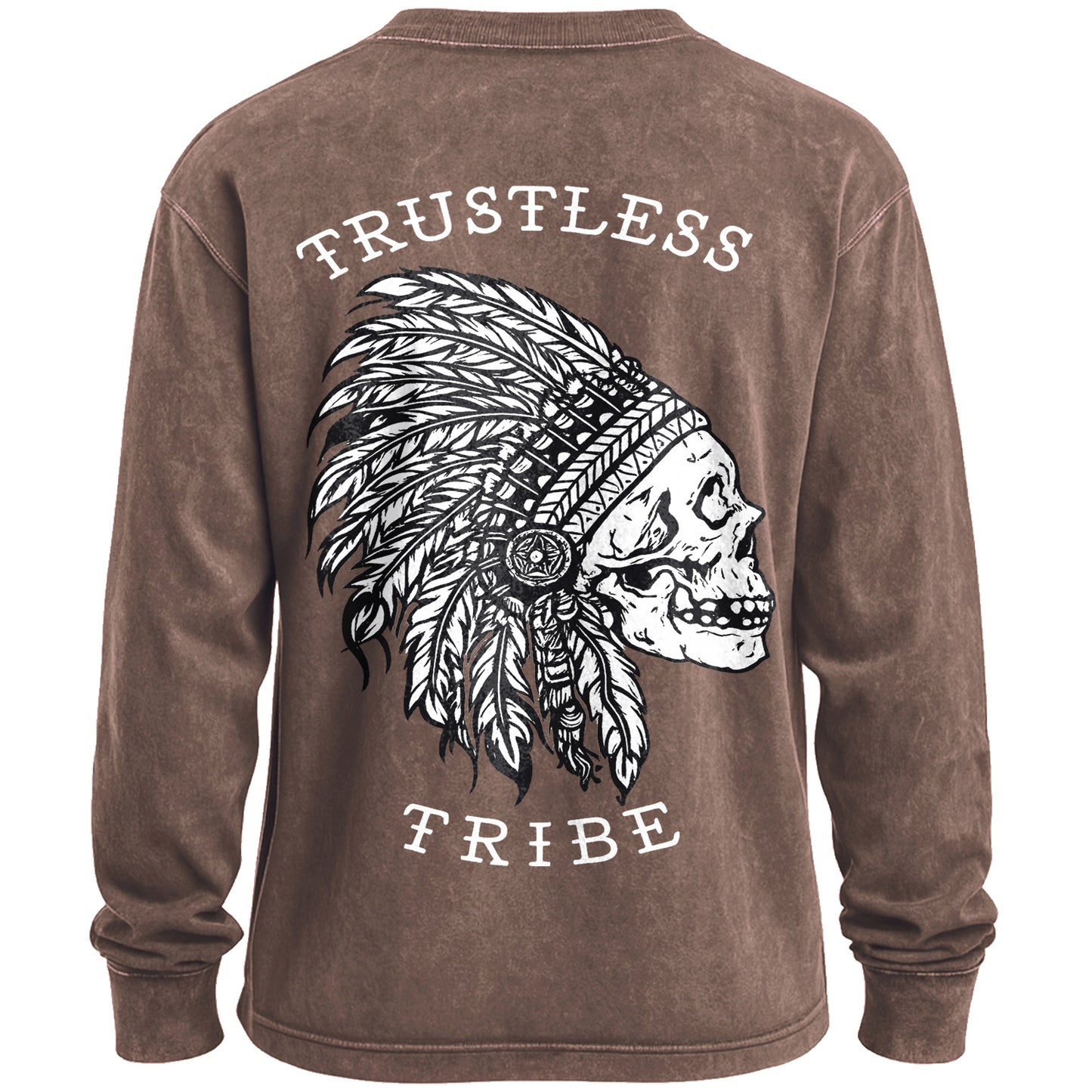 Precio regular $24.99 USDRide-your-own-way energy. This vintage-washed grey long-sleeve T-shirt features a bold back graphic: a white line-art skull in a feather headdress with arched text reading “TRUSTLESS TRIBE.” Front is clean for an easy, everyday wear. Cut from soft 100% cotton with a broken-in feel out of the bag.