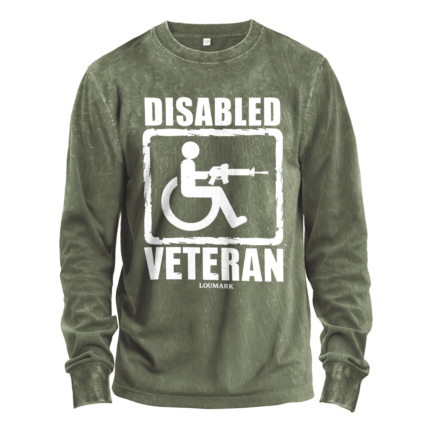 This vintage-washed military olive shirt features a distressed white front graphic: a wheelchair icon in a rugged badge with stacked text reading “DISABLED VETERAN.”