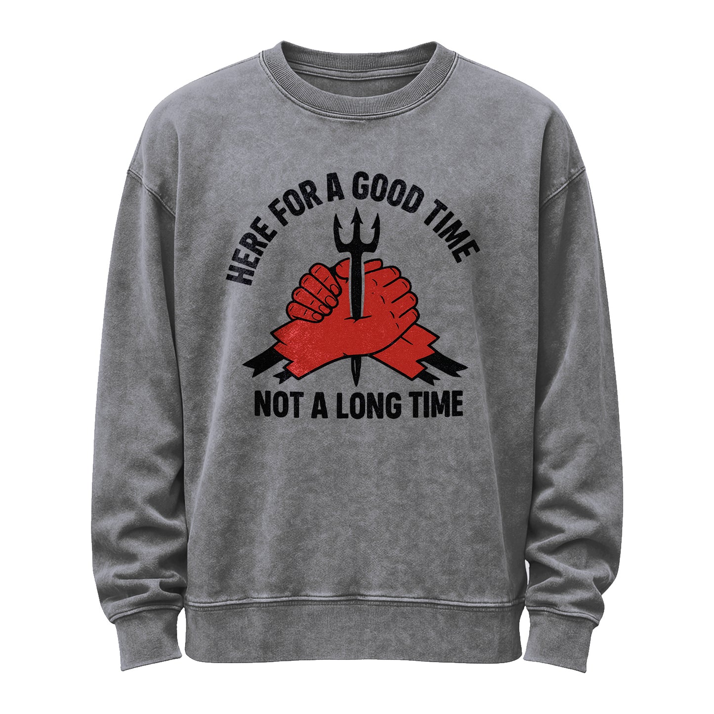 Prix régulier $45.00 USDLive it up. This vintage-washed ash grey sweatshirt features bold black typography—“HERE FOR A GOOD TIME / NOT A LONG TIME”—framing a striking red hands-and-trident graphic over a ribbon. Built from substantial 350g fleece (80% cotton / 20% polyester) for a soft, broken-in feel right out of the bag.