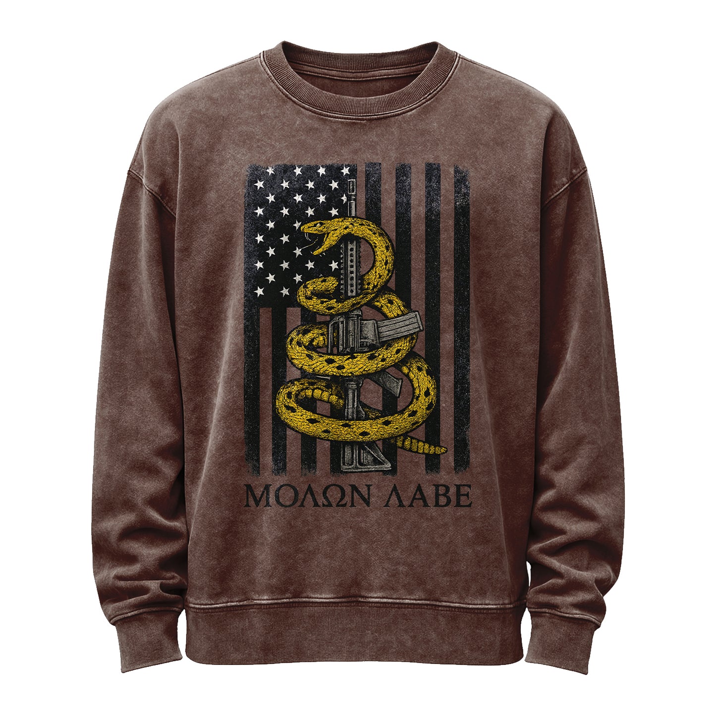Prix régulier $45.00 USDBold and battle-worn. This vintage-washed army-green sweatshirt features a distressed grayscale American flag with a coiled yellow rattlesnake wrapped around a rifle and the Greek phrase “ΜΟΛΩΝ ΛΑΒΕ.” Built from substantial 350g fleece (80% cotton / 20% polyester) for a soft, broken-in feel right out of the bag.