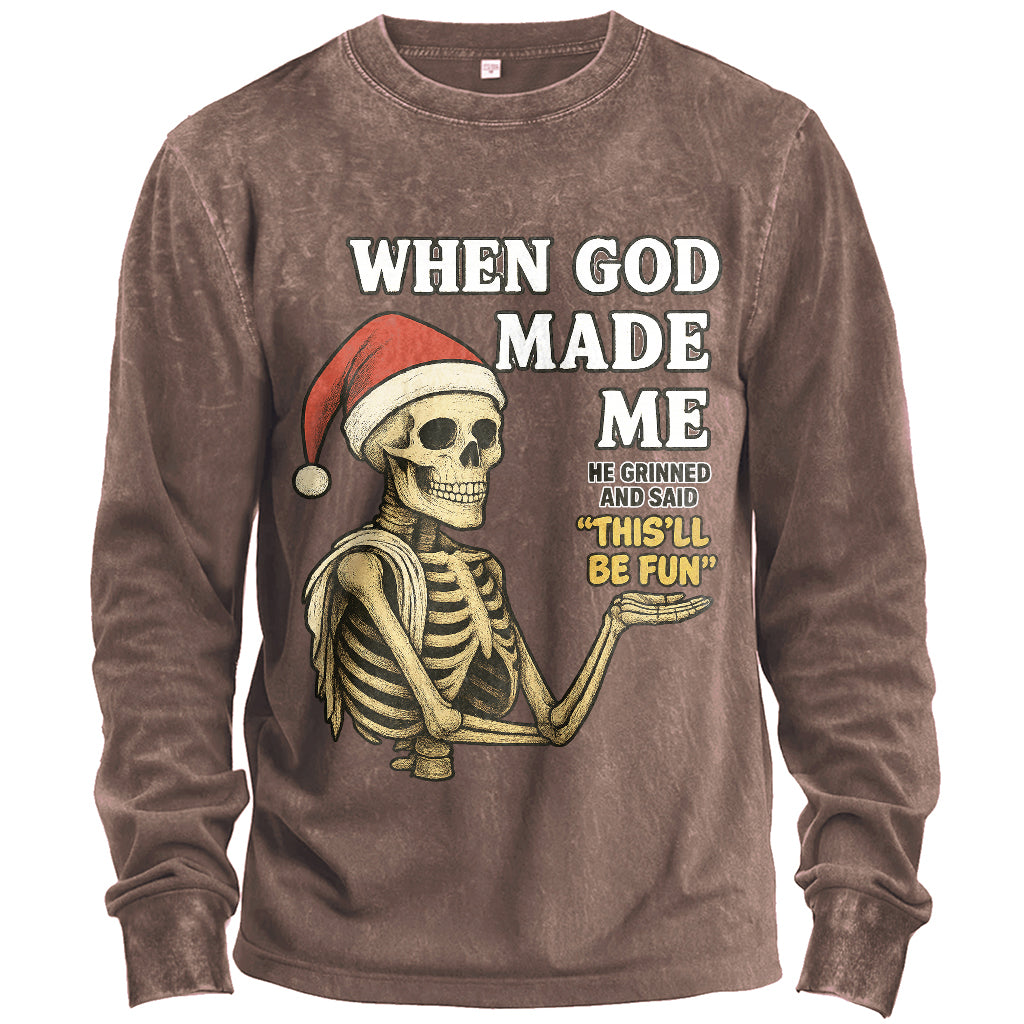 Prix régulier $24.99 USDSnarky holiday spirit with a vintage vibe. This men’s long-sleeve T-shirt features a retro skeleton in a Santa hat with the line “When God Made Me, He Grinned and Said ‘This’ll Be Fun.’” The army-green body is vintage-washed for lived-in comfort and made to take crisp DTG prints.