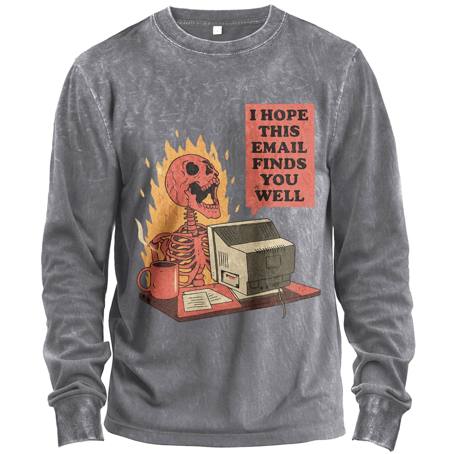 Prezzo normale $24.99 USDL'ironia del lavoro e della vita privata, immortalata. Questa T-shirt a maniche lunghe verde militare, con effetto vintage, raffigura uno scheletro al computer, con fiamme che si accendono sullo sfondo e una didascalia che recita "SPERO CHE QUESTA EMAIL TI TROVI BENE". Cotone morbido e traspirante, con una sensazione di comfort fin dal primo giorno.