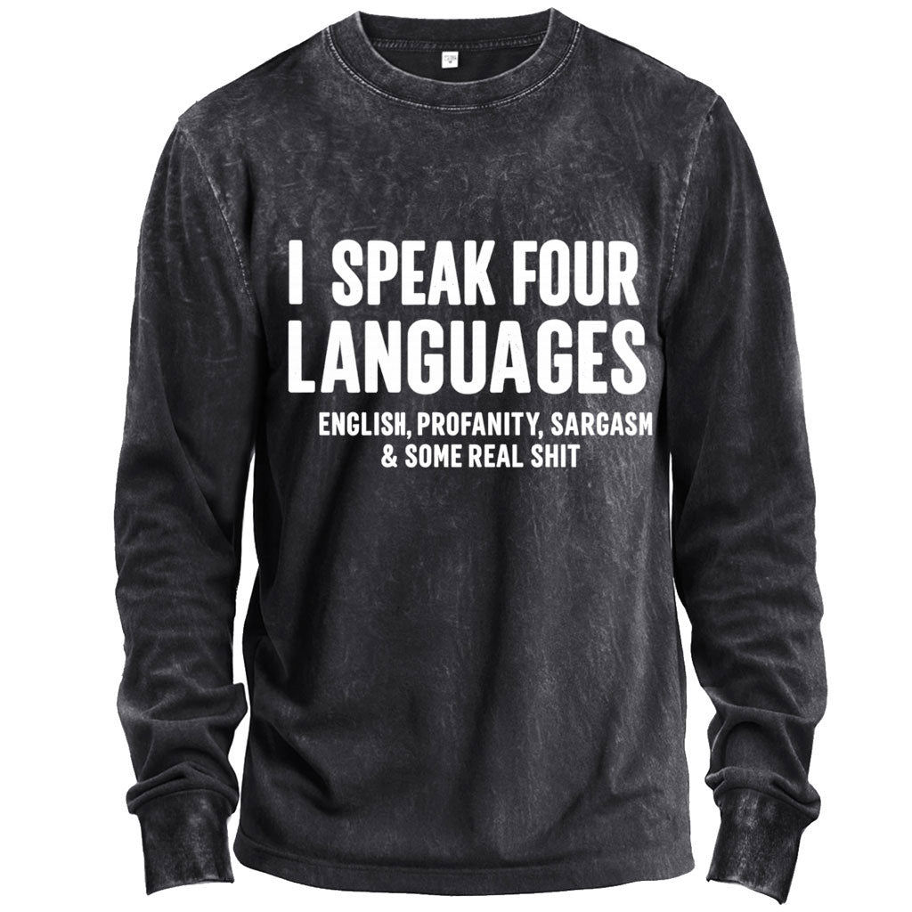 Prezzo normale $24.99 USDMostra il tuo umorismo con disinvoltura con la maglietta a maniche lunghe LouMark "Parlo quattro lingue". Un design spiritoso per chi comunica con sarcasmo e personalità.