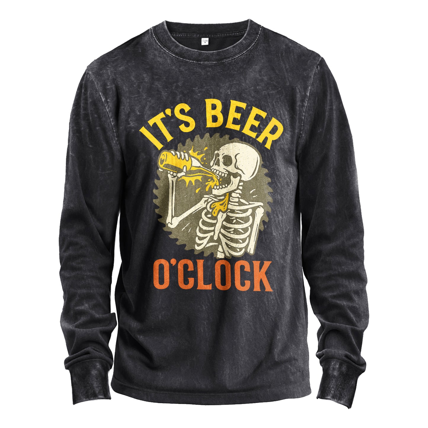 Prezzo normale $24.99 USDEsci e stappane una. Questa maglietta a maniche lunghe in stile vintage presenta uno scheletro sorridente che tracanna una lattina sotto la scritta "IT'S BEER O'CLOCK" in giallo e arancione retrò. Realizzata in robusto cotone da 230 g, è morbida, robusta e pensata per i momenti di divertimento.