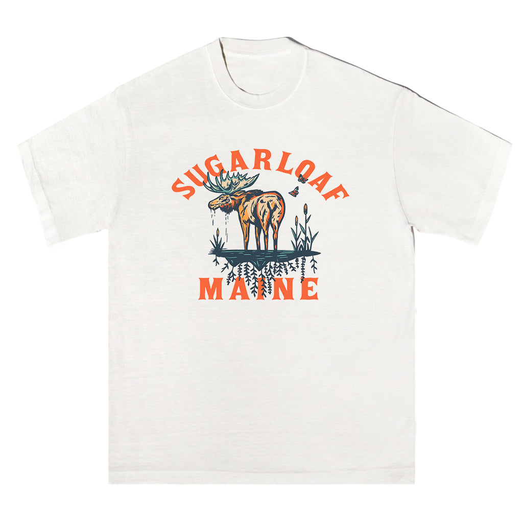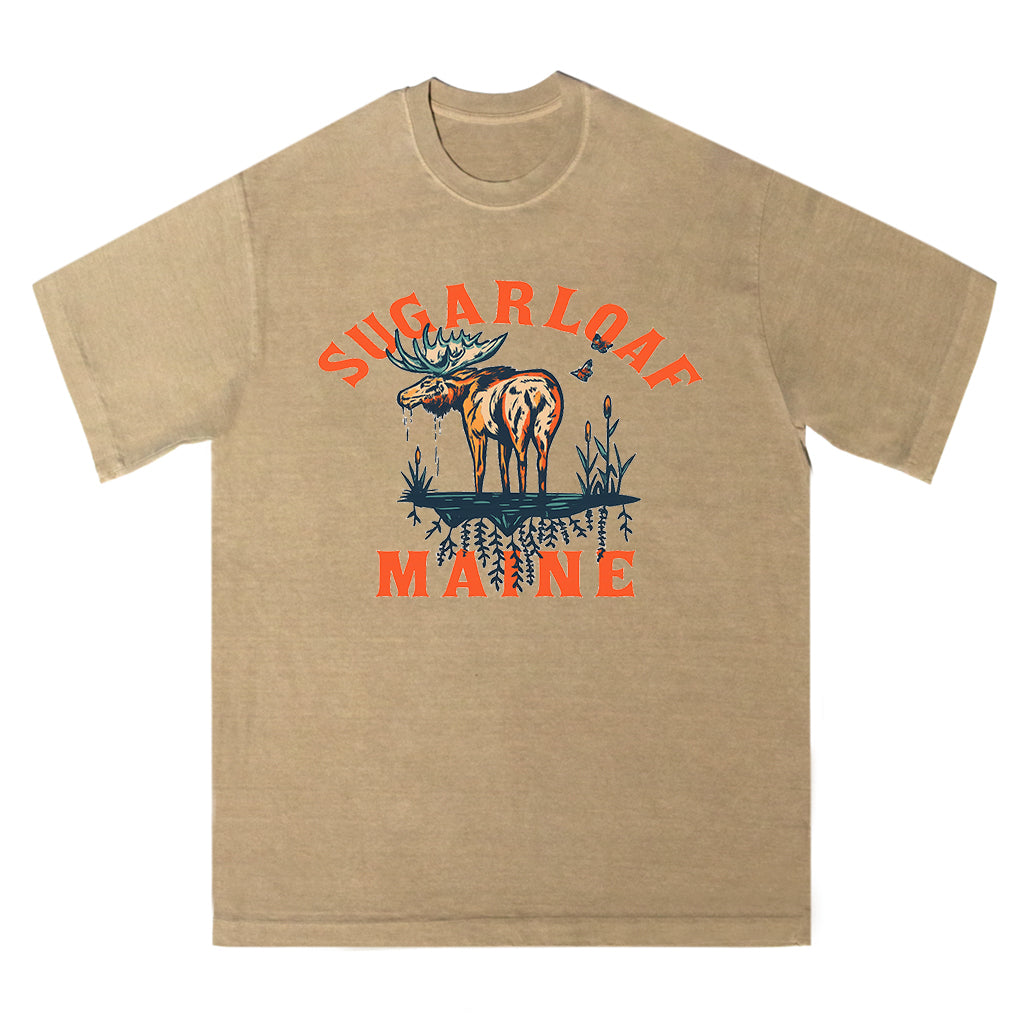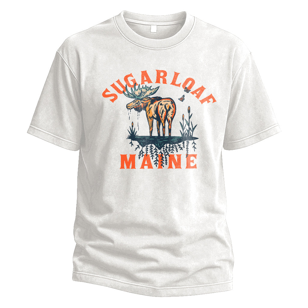 Celebra la bellezza selvaggia del Maine con la maglietta Sugarloaf Maine Moose di LouMark. Questa maglietta blu navy slavato presenta una grafica in stile vintage di un maestoso alce sullo sfondo di una natura selvaggia, incorniciata dalla scritta "SUGARLOAF MAINE" in grassetto e in un arancione rustico. Realizzata in morbido cotone al 100%, è perfetta per le avventure all'aria aperta e per l'abbigliamento casual.