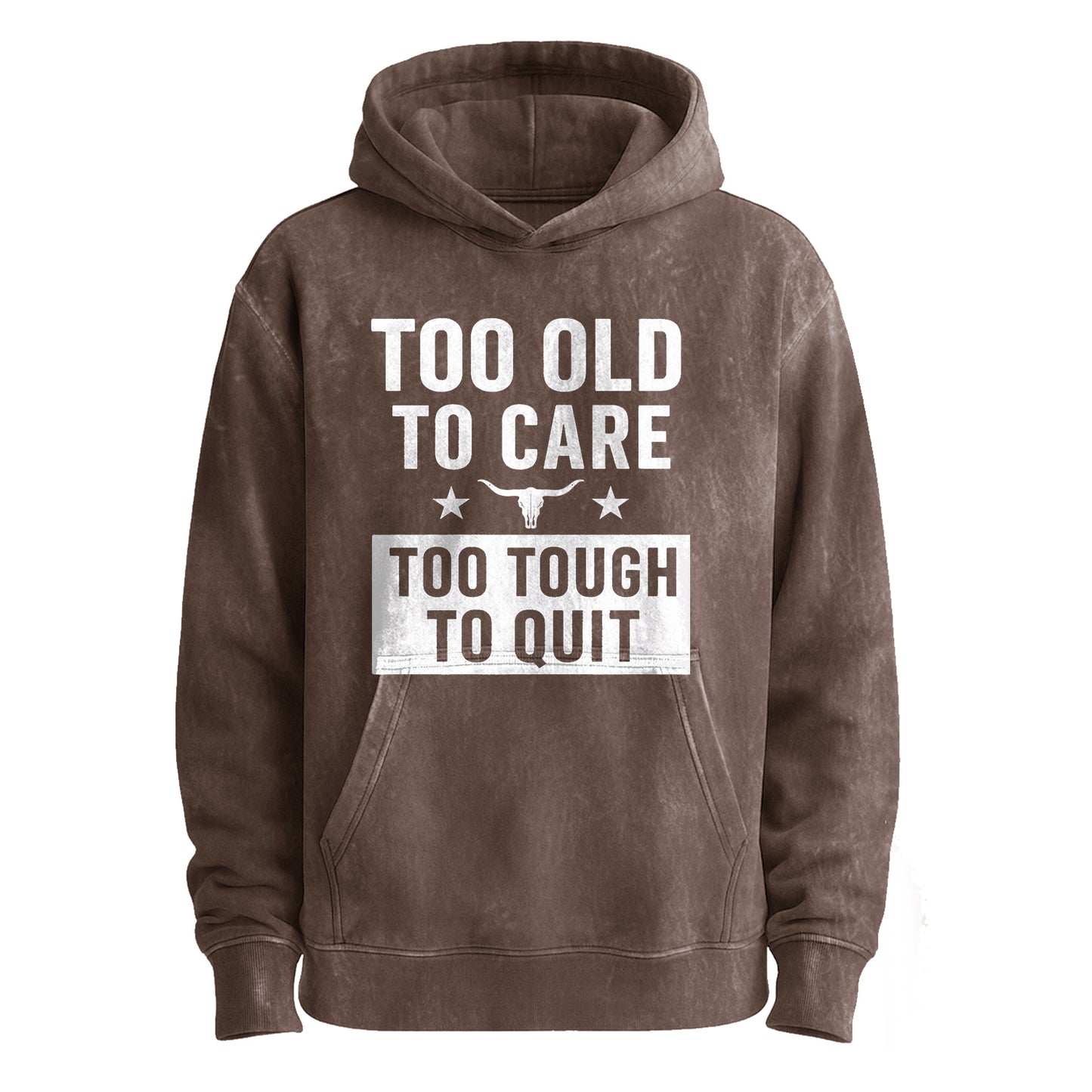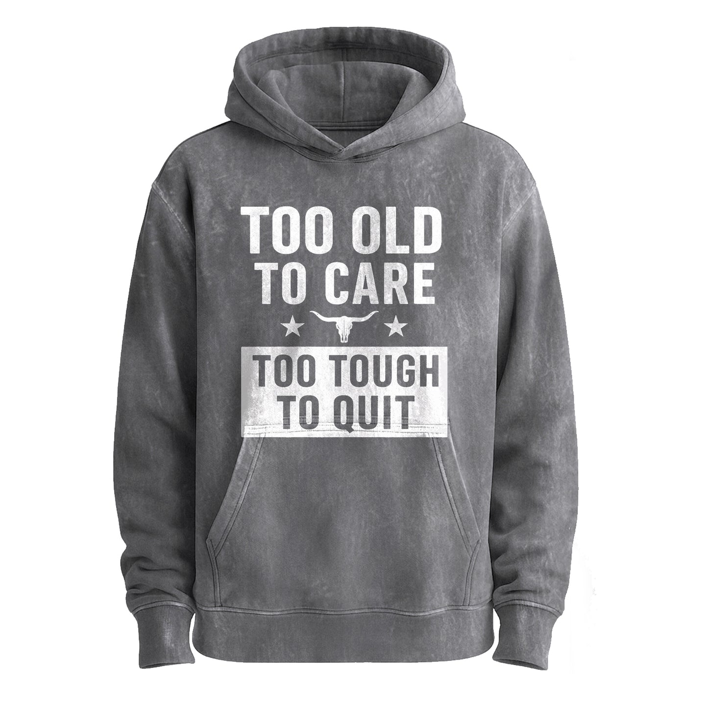 Questa felpa con cappuccio verde militare vintage presenta una scritta bianca in grassetto e consumata: "TOO OLD TO CARE" sovrastata da un distintivo a blocchi con la scritta "TOO TOUGH TO QUIT", affiancato da stelle e da un'icona a forma di teschio con le corna lunghe.