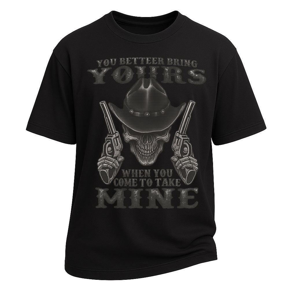 Regular price $26.99 USDUnleash your inner outlaw with the LouMark "Cowboy Skull Gunslinger" graphic t-shirt. Featuring a bold skull in a cowboy hat flanked by revolvers and the fearless slogan “You Better Bring Yours When You Come to Take Mine,” this design captures the raw attitude of the Wild West. Made from 260G heavy-weight 100% cotton, it delivers oversized comfort, durability, and a rugged streetwear edge perfect for western enthusiasts and modern rebels alike.
