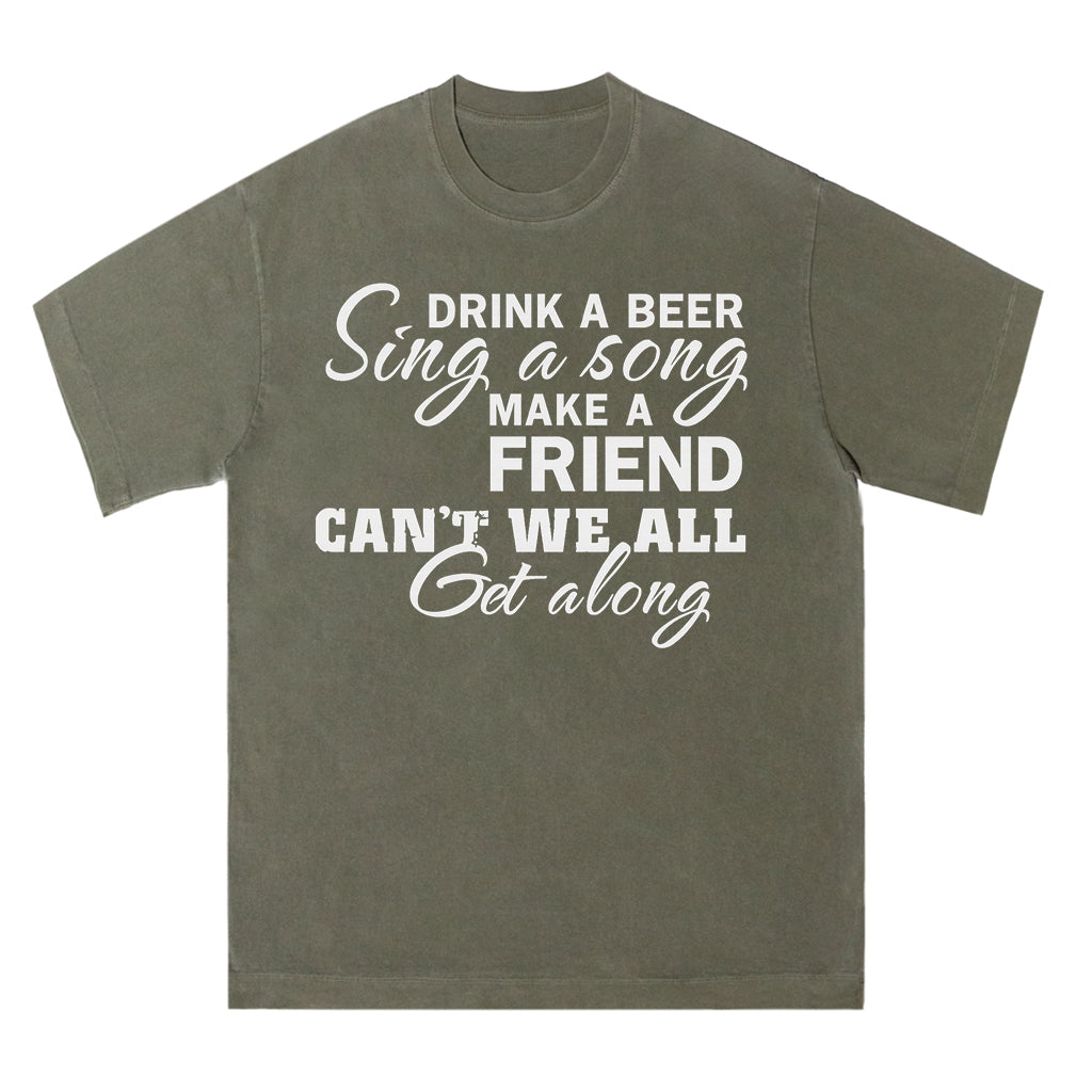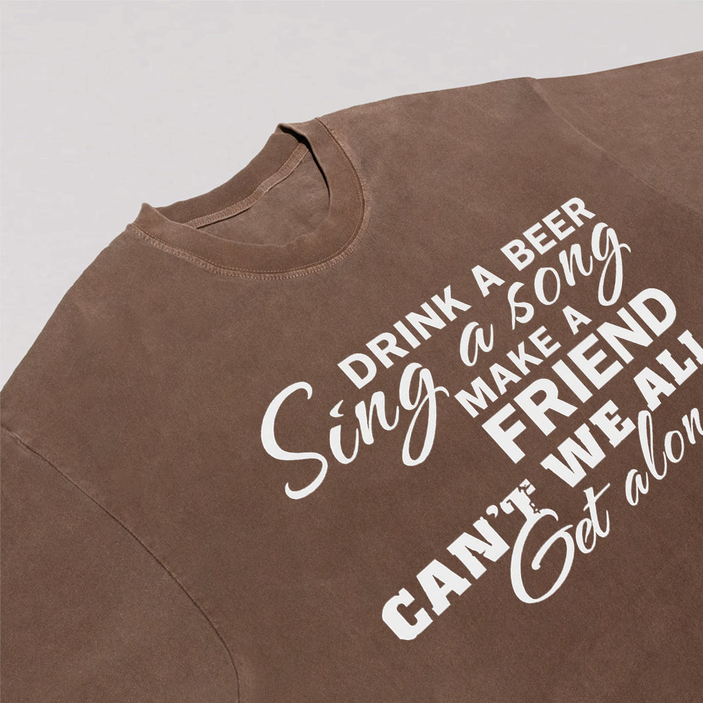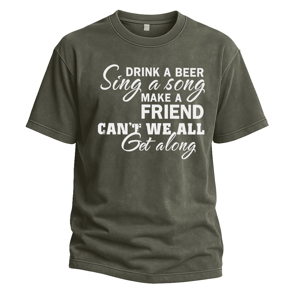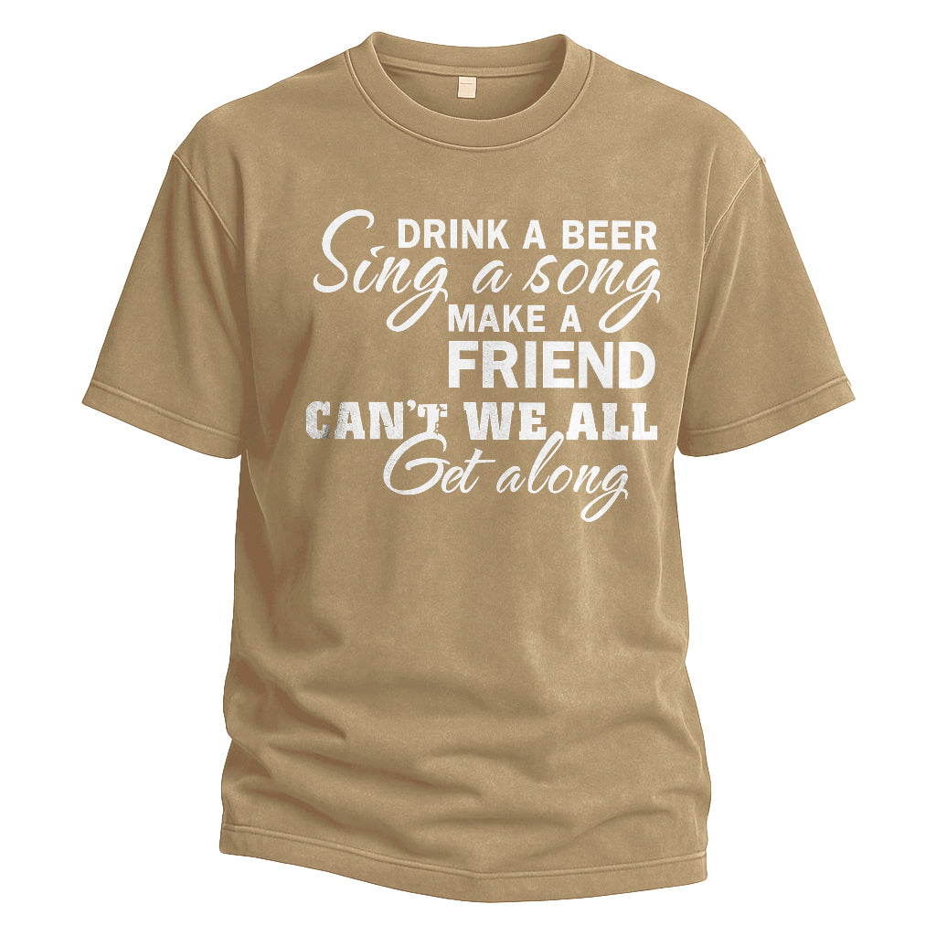 Regular price $26.99 USDCelebrate good times and friendship with LouMark’s Drink a Beer Sing a Song Tee. This washed tan shirt features a vintage-style white typography graphic with the phrase “DRINK A BEER SING A SONG MAKE A FRIEND CAN’T WE ALL GET ALONG.” Made from 100% cotton for comfortable, casual wear with a warm, welcoming vibe.