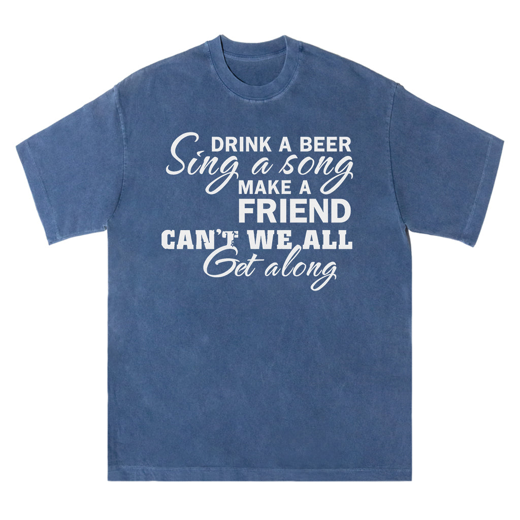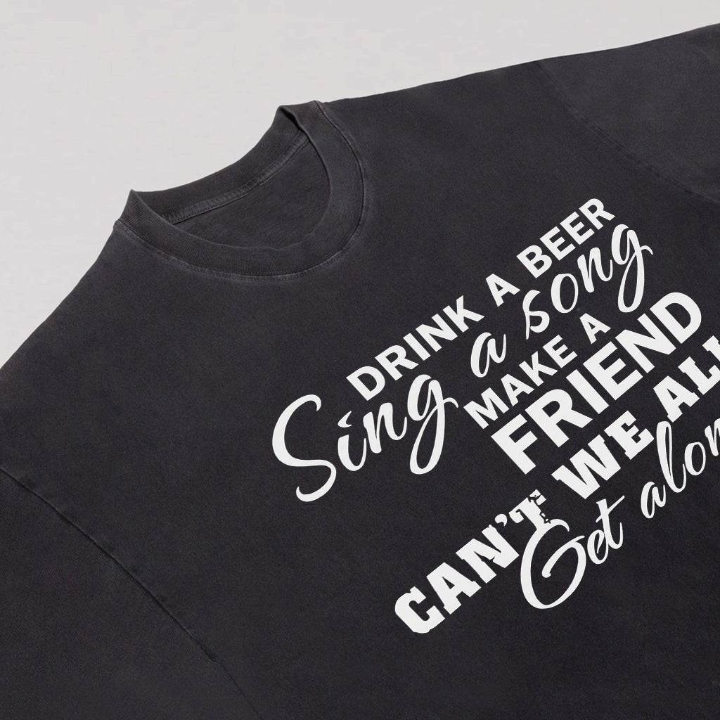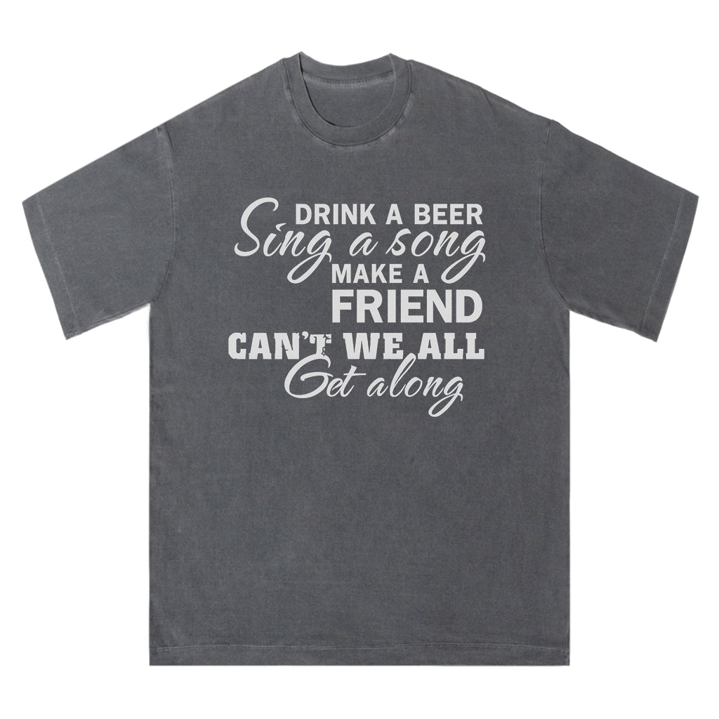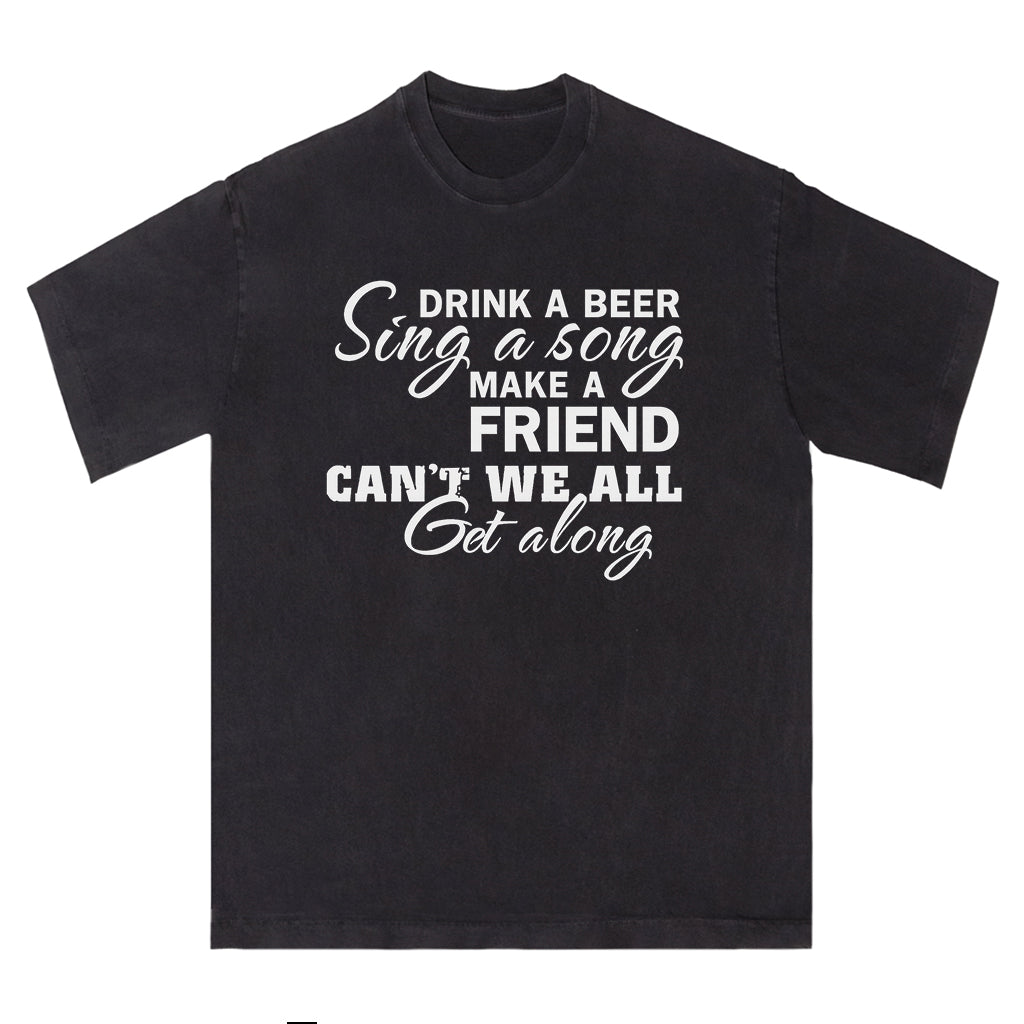 Regular price $26.99 USDCelebrate good times and friendship with LouMark’s Drink a Beer Sing a Song Tee. This washed tan shirt features a vintage-style white typography graphic with the phrase “DRINK A BEER SING A SONG MAKE A FRIEND CAN’T WE ALL GET ALONG.” Made from 100% cotton for comfortable, casual wear with a warm, welcoming vibe.