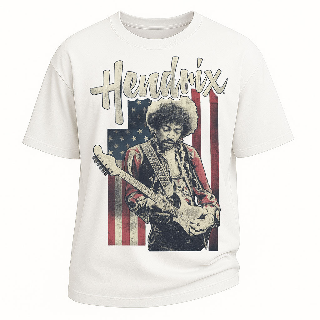 Regular price $26.99 USDShowcase legendary rock style with this Hendrix American flag graphic short-sleeve t-shirt. Made from 260G 100% cotton, this heavyweight tee delivers durability with a comfortable feel. The front features a striking print of Hendrix with guitar overlaid on the American flag, paired with bold text, creating a vintage rock aesthetic. Designed with a standard fit and classic crew neckline, this tee is perfect for concerts, casual wear, or streetwear outfits.