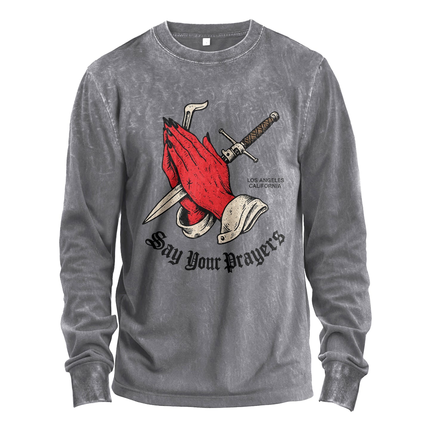 Regular price $24.99 USDGritty faith-meets-streetwear. Vintage-washed olive long sleeve with a bold graphic of red praying hands over crossed blade & sword, and arched gothic “Say Your Prayers.” Built from hefty 230g cotton for softness and durability.