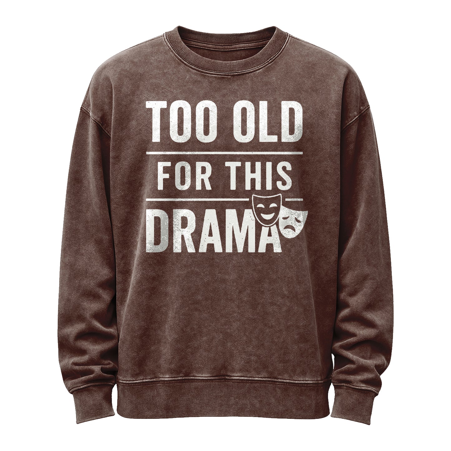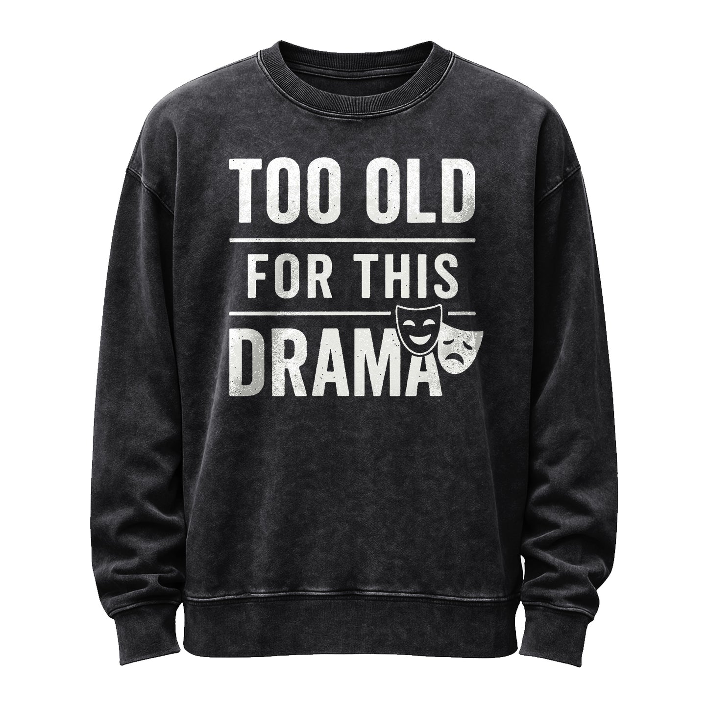 This vintage washed-black crewneck features oversized, distressed white typography reading “TOO OLD / FOR THIS / DRAMA,” separated by clean rules and paired with classic comedy–tragedy masks.