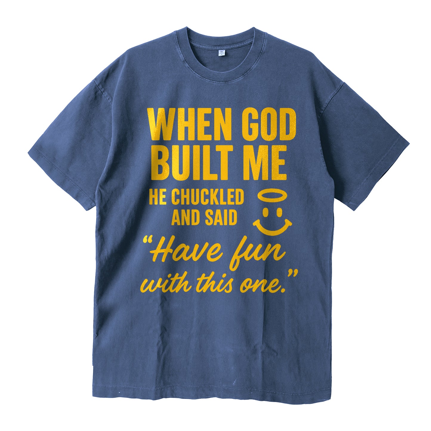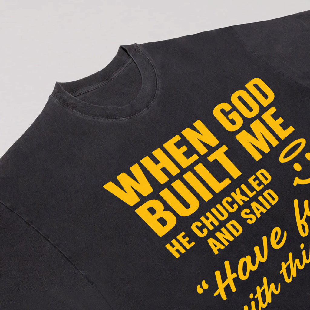 Regular price $26.99 USD“Have fun with this one.” LouMark’s When God Built Me Tee mixes bold block lettering with playful script and a halo-smile graphic for a cheeky faith-forward vibe. Cut from dense 260g cotton and washed for a broken-in hand, this relaxed tee is equal parts comfort and confidence.