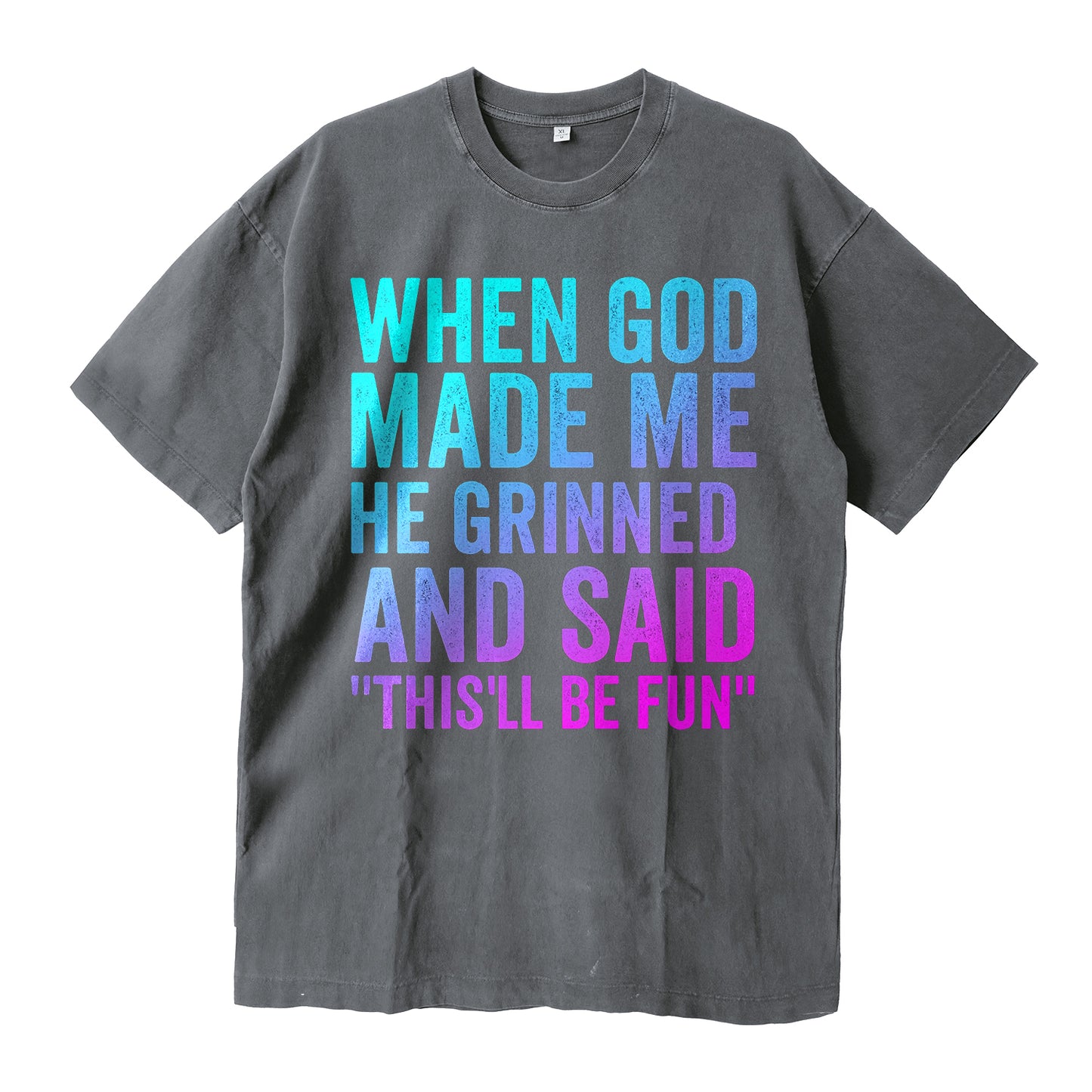 Regular price $26.99 USDPlayfully bold and faith-forward. LouMark’s When God Made Me Tee splashes a vivid blue-to-purple gradient across heavyweight black fabric with the line: “WHEN GOD MADE ME HE GRINNED AND SAID ‘THIS’LL BE FUN.’” Washed finish for a lived-in feel, cut in a relaxed silhouette from dense 260g cotton.