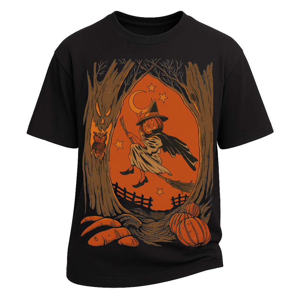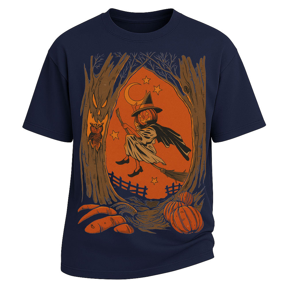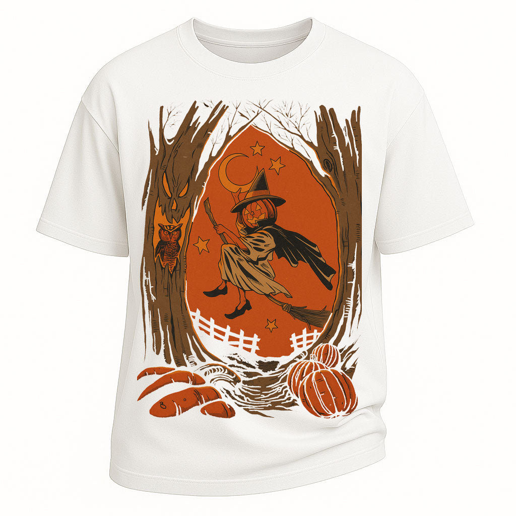 Regular price $26.99 USDStep into the spirit of Halloween with LouMark’s "Witch Pumpkin Patch" oversized tee. Crafted from 260G heavyweight 100% cotton, this shirt offers durability, comfort, and a premium oversized silhouette. The front showcases a vintage-inspired illustration of a witch flying past a crescent moon, framed by autumn trees, pumpkins, and rustic fall elements. Designed for those who love Halloween charm with a touch of retro artistry, it’s the perfect seasonal statement piece.
