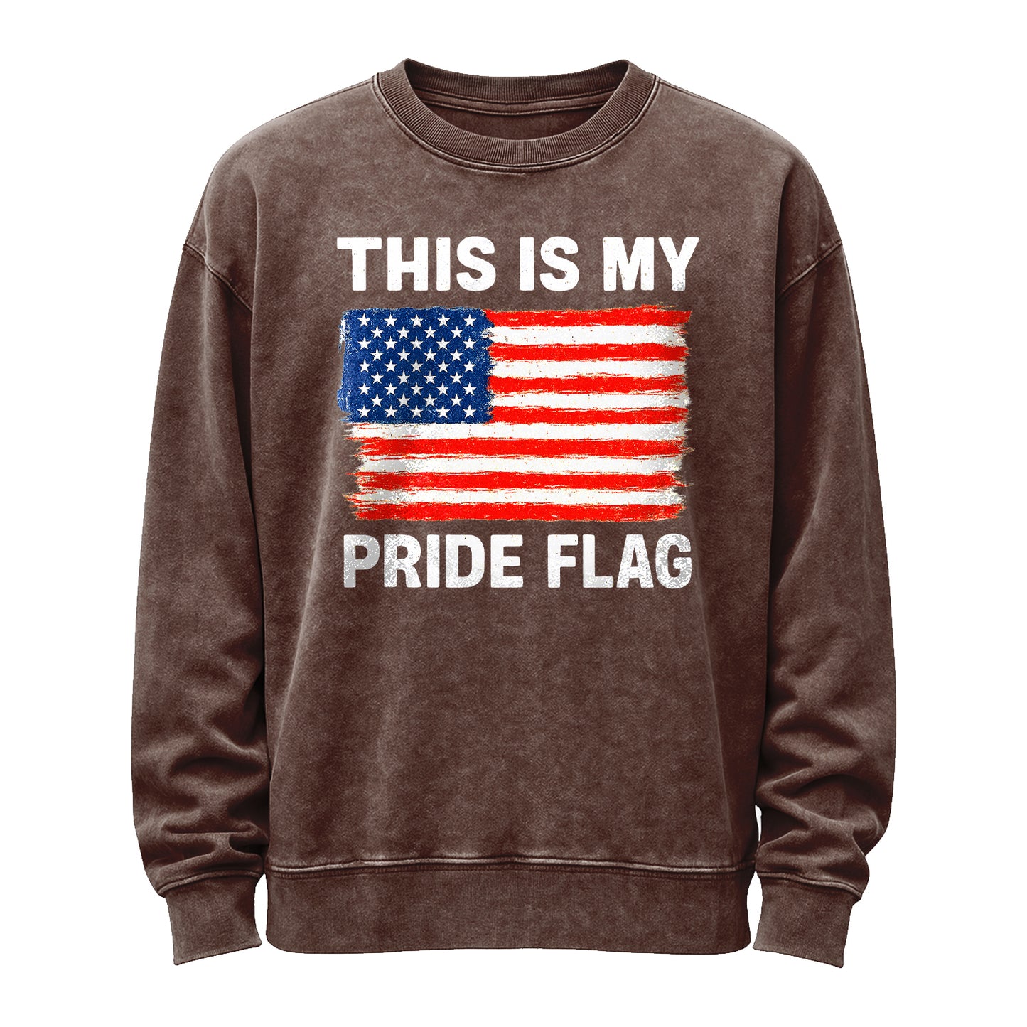 Preço Regular $45.00 USDPatriotic to the core. This vintage-washed black sweatshirt features bold distressed typography—“THIS IS MY PRIDE FLAG”—with a brush-stroke American flag front and center. Built from substantial 350g fleece (80% cotton / 20% polyester) for a soft, broken-in feel right out of the bag.