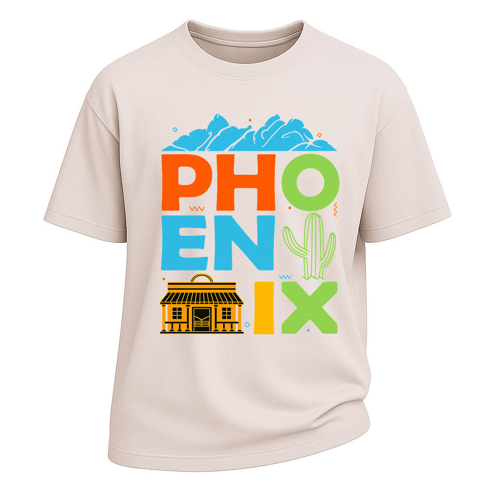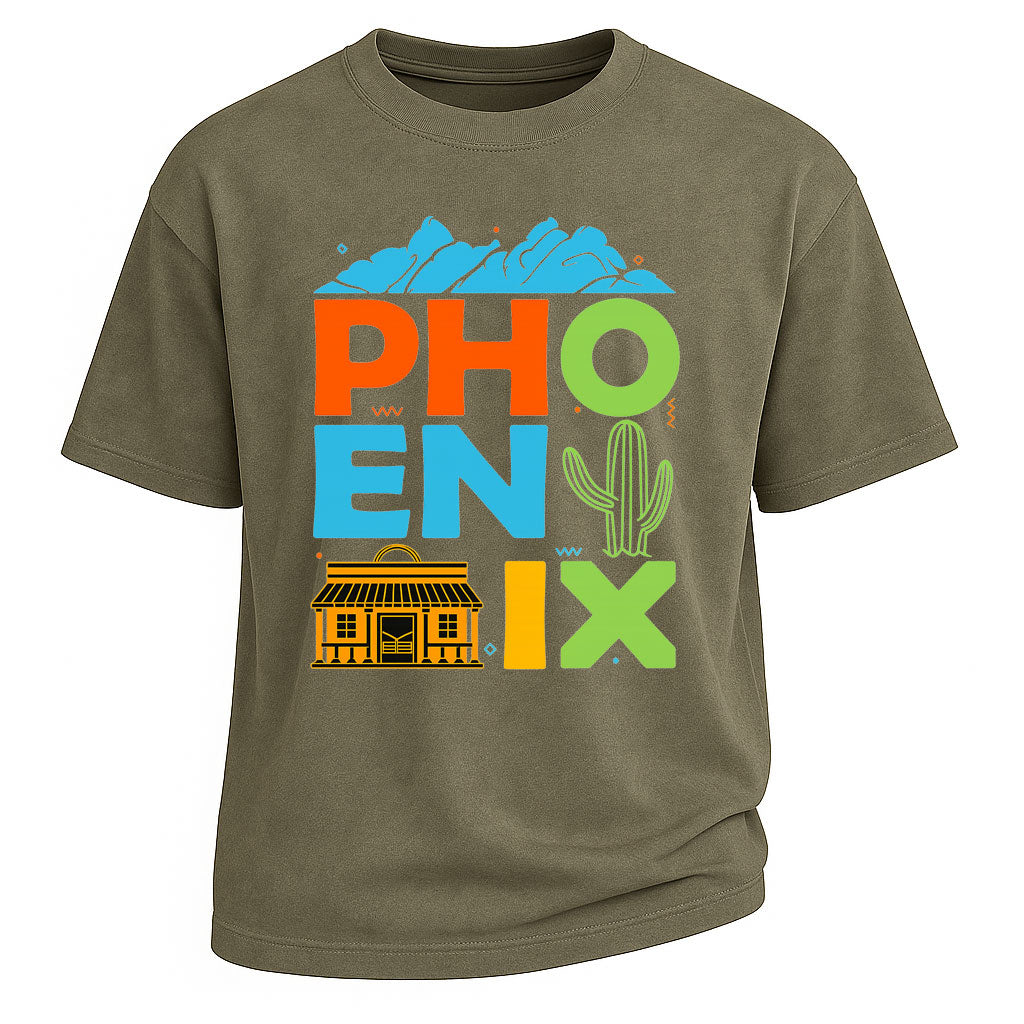 This graphic tee merges city pride with western aesthetic, making it an essential piece for Phoenix locals, travelers, and fans of bold southwestern style.