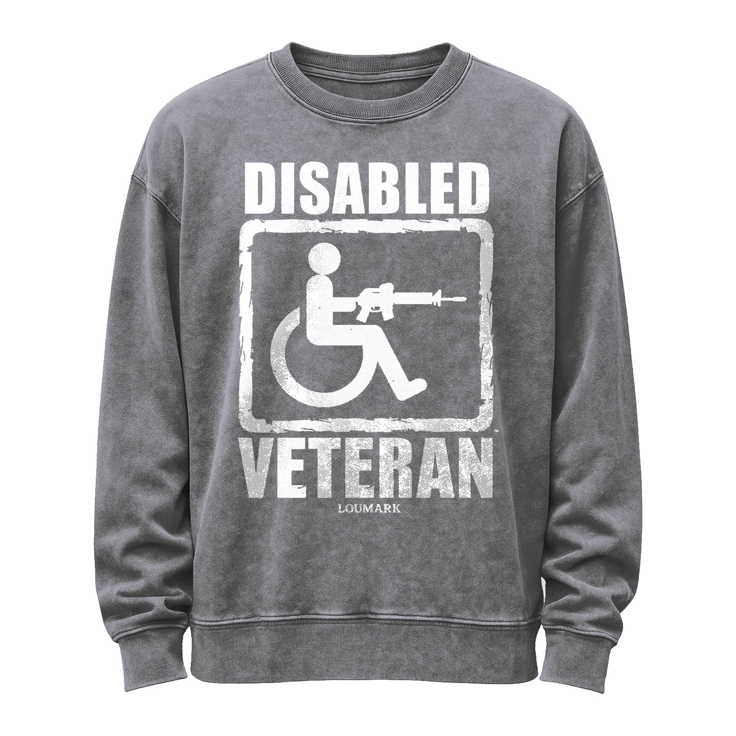 This vintage washed-black crewneck features a bold, distressed white front graphic: a wheelchair icon framed in a rugged badge with stacked text reading “DISABLED VETERAN.”
