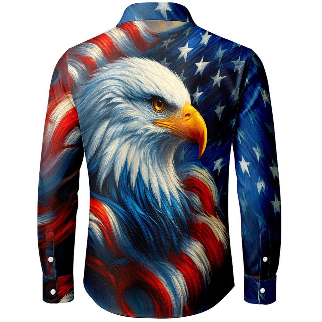 Preço Regular $29.99 USDTurn heads with a bold allover 3D print: a majestic bald eagle set against sweeping red, white, and blue flag waves. This lightweight, silky long-sleeve shirt is made from durable 100% polyester for vivid color, wrinkle resistance, and easy care—perfect for parties, parades, and weekend statements.